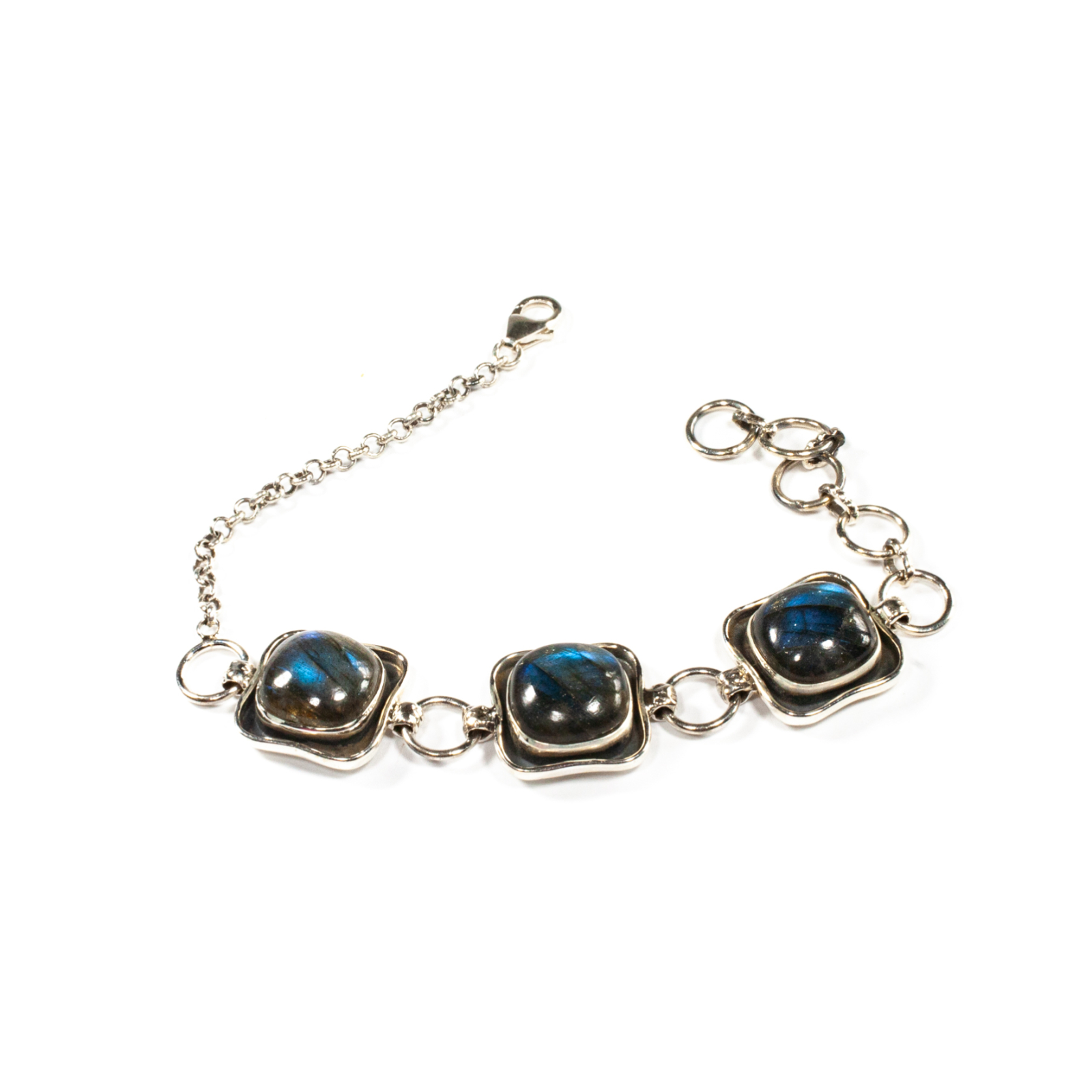 Brățară din argint patinat ce conține pietre cu tăietură caboșon de labradorit de formă rotundă, încasetate pe contur. Montura este realizată manual, de artizani din Bali, renumiți pentru măiestria lor în confecționarea bijuteriilor. Este o brățară fină, elegantă și rafinată. Brățara este prevazută cu sistem de prindere tip carabină și se termină cu lanț de prelungire pentru a se ajusta după preferința dumneavoastră. Pentru un efect stilistic complet, puteți accesoriza această brățară cu cercei sau inel în același ton, disponibile în colecțiile Sheba.