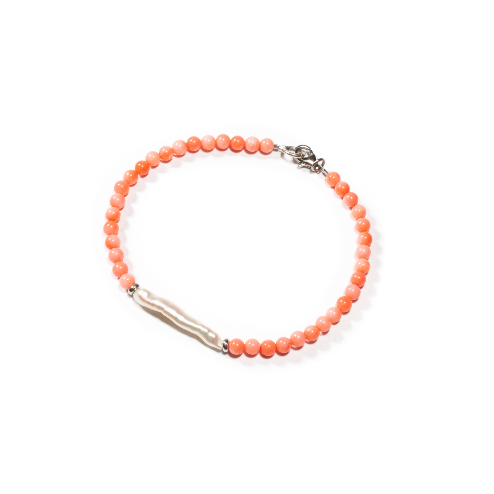 Brățară realizată manual în atelierele Sheba din pietre naturale, cu accesorii din argint. Brățara este realizată din pietre cu tăietură caboșon de coral de formă sferică, iar în centrul compoziției se evidențiază o perlă de cultură cu formă organică, ce adaugă un contrast rafinat și o notă de eleganță clasică. Accesoriile din argint completează armonios designul, conferind bijuteriei un aspect sofisticat și feminin. Pietrele sunt înșirate pe suport din oțel filetat acoperit cu peliculă de protecție, special creat pentru confecționarea bijuteriilor. Sistemul de prindere este tip carabină și la cerere se poate adăuga un lănțișor de prelungire. Pentru a vă accesoriza această brățară vă puteți comanda în funcție de preferințe și de ținuta la care doriți să o purtați, cercei sau colier în set.