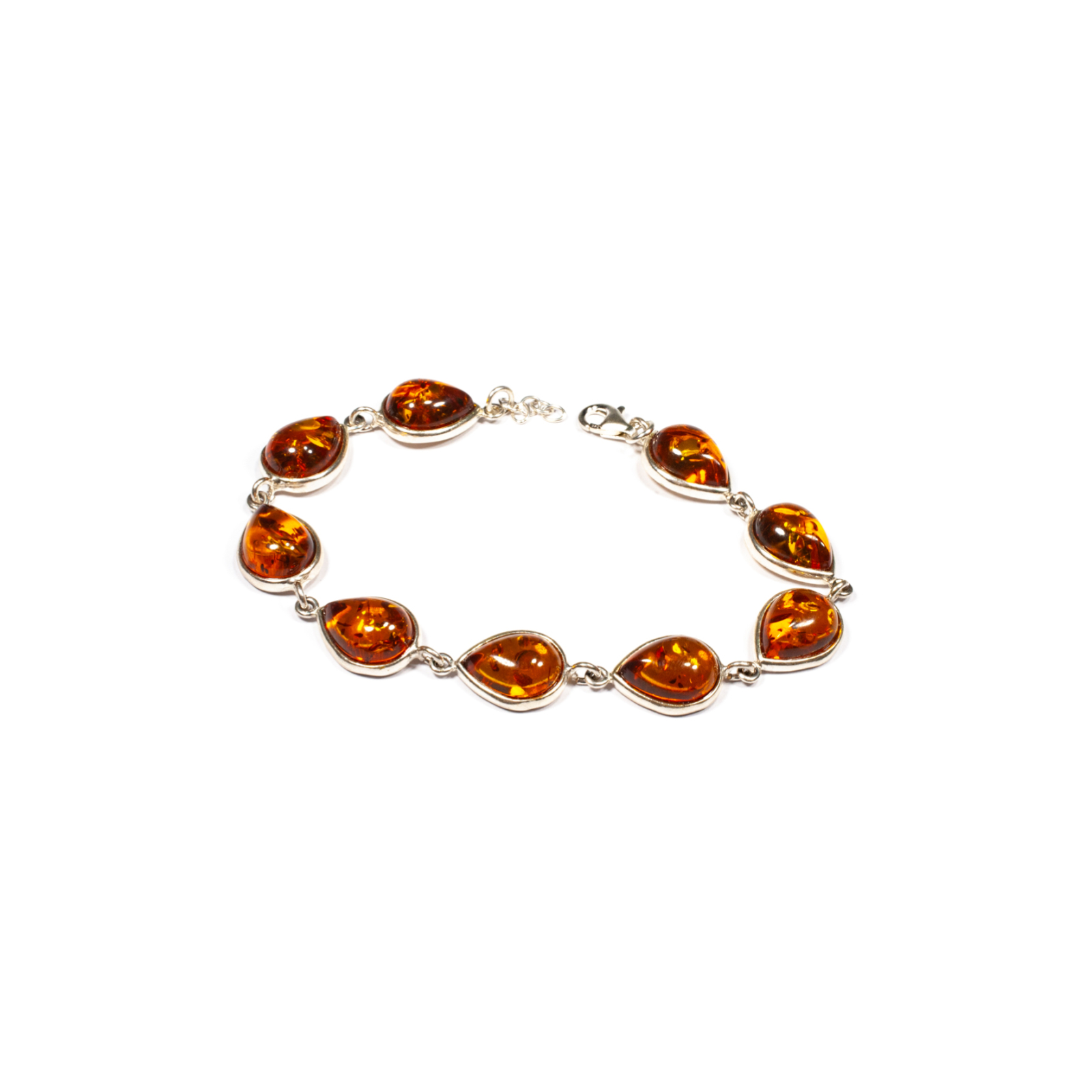 Brăţară unicat din argint, lucrată manual, cu chihlimbar natural. Brățara este compusă din pietre cu tăietură caboșon de chihlimbar de formă lacrimă, încasetate pe contur. Modelul și finisajul simplu și elegant este realizat pe conturul pietrelor, pentru a le scoate în evidență culoarea și strălucirea minunată. Brățara este prevazută cu sistem de prindere tip carabină și are un lanț de prelungire pentru a se putea regla perfect pe încheietura dumneavoastră. Puteți solicita ajutorul consilierilor Sheba pentru a comanda și o pereche de cercei potrivită.