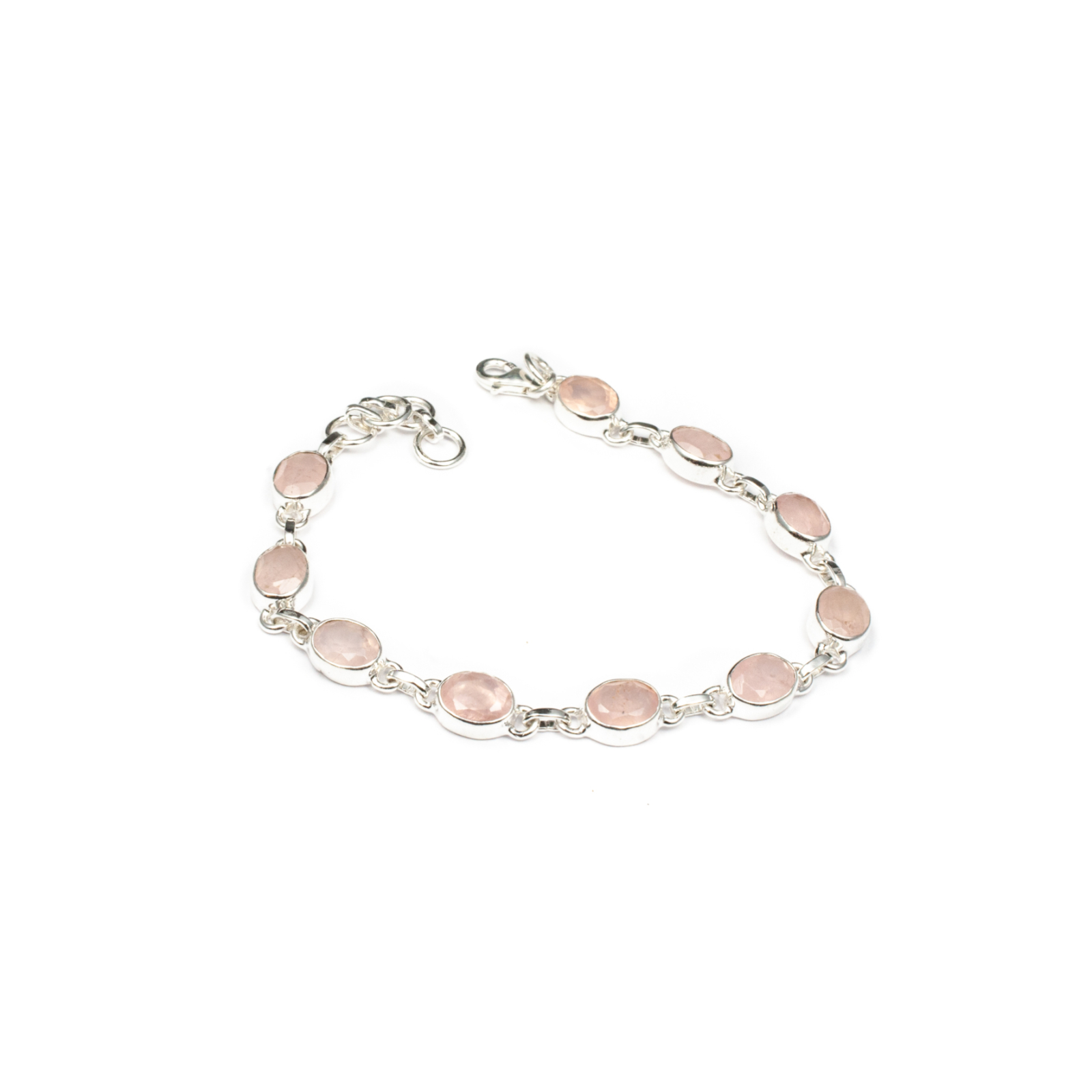 Brățara din argint conține zece pietre fațetate de cuarț roz de formă ovală, încasetate pe contur. Montura este realizată manual, de artizani din Bali, renumiți pentru măiestria lor în confecționarea bijuteriilor. Este o brățară fină, elegantă și rafinată. Brățara este prevazută cu sistem de prindere tip carabină și are un lanț de prelungire pentru a se putea regla perfect pe încheietura dumneavoastră. Puteți solicita ajutorul consilierilor Sheba pentru a comanda și o pereche de cercei sau un inel potrivit.