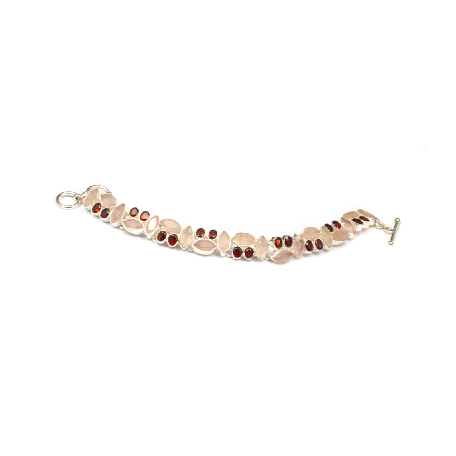 Brățara din argint conține pietre fațetate de cuarț roz de formă marchiză și pietre fațetate de granat de formă ovală, încasetate pe contur. Montura este realizată manual, de artizani din Bali, renumiți pentru măiestria lor în confecționarea bijuteriilor. Este o brățară fină, elegantă și rafinată. Brățara este prevazută cu sistem de prindere tip carabină și are un lanț de prelungire pentru a se putea regla perfect pe încheietura dumneavoastră. Puteți solicita ajutorul consilierilor Sheba pentru a comanda și o pereche de cercei sau un inel potrivit.