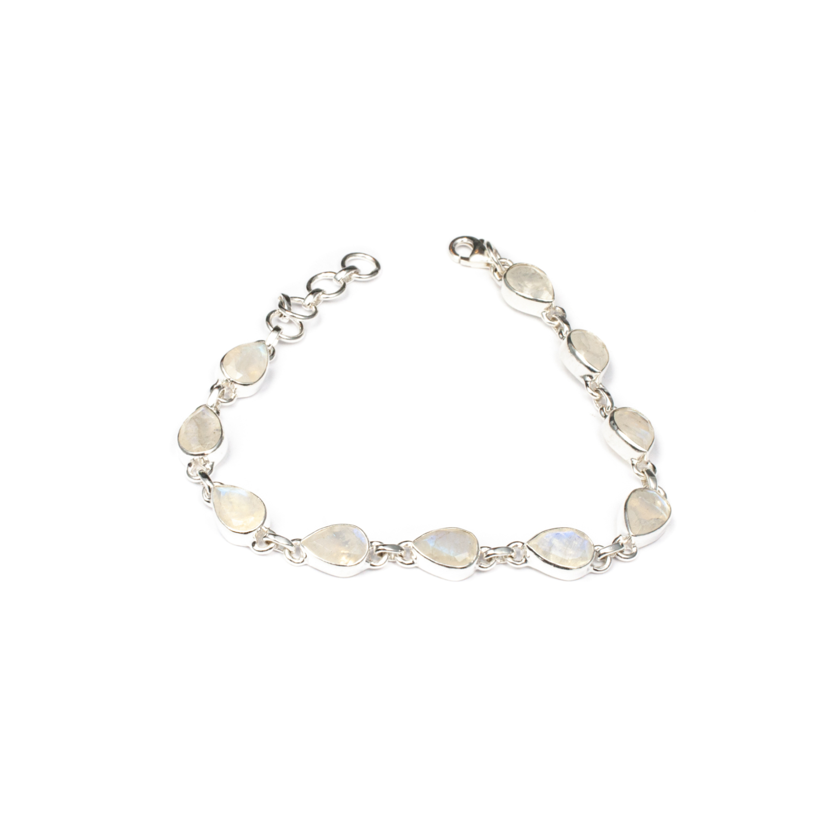 Brățara din argint conține zece pietre fațetate de piatra lunii de formă lacrimă, încasetate pe contur. Montura este realizată manual, de artizani din Bali, renumiți pentru măiestria lor în confecționarea bijuteriilor. Este o brățară fină, elegantă și rafinată. Brățara este prevazută cu sistem de prindere tip carabină și are un lanț de prelungire pentru a se putea regla perfect pe încheietura dumneavoastră. Puteți solicita ajutorul consilierilor Sheba pentru a comanda și o pereche de cercei sau un inel potrivit.
