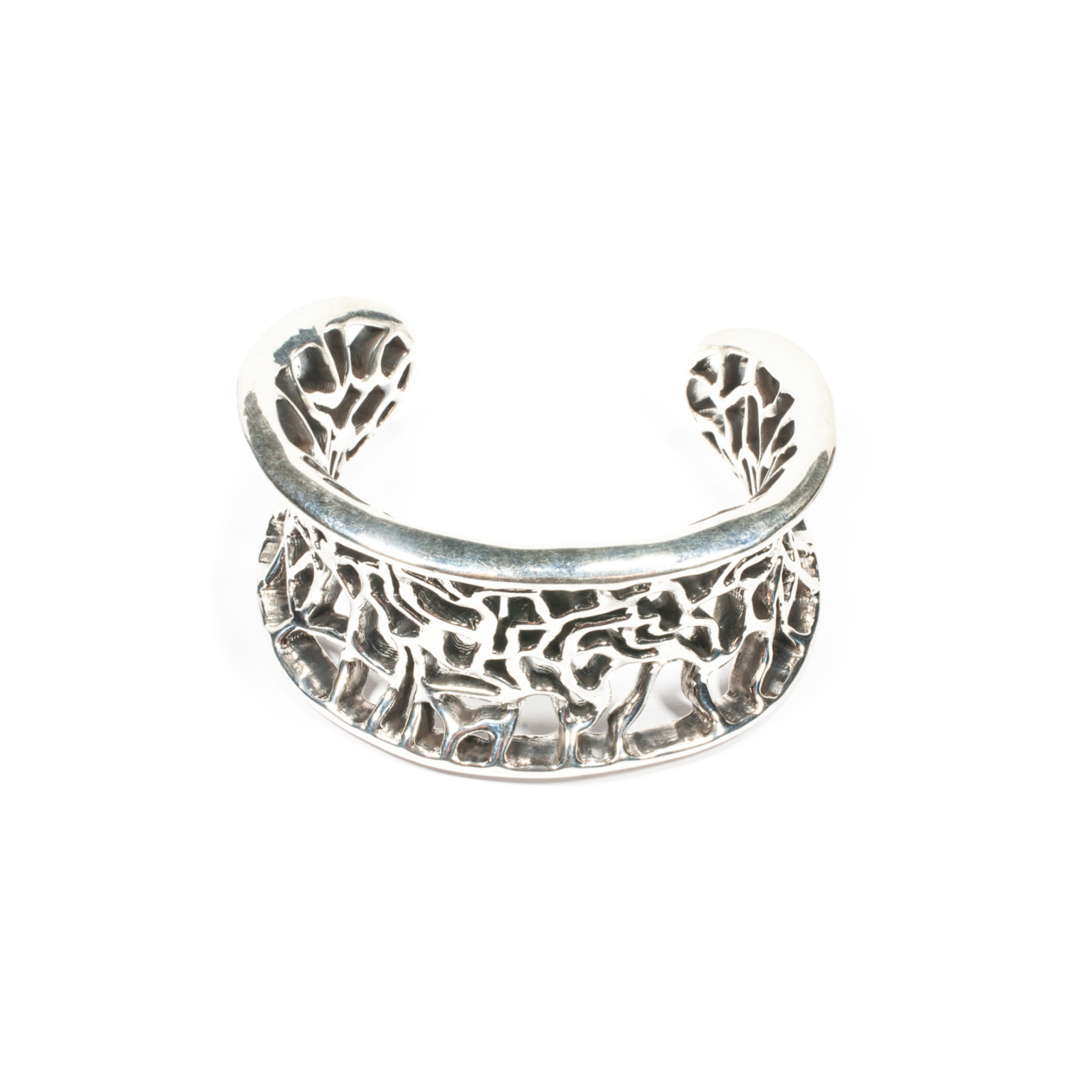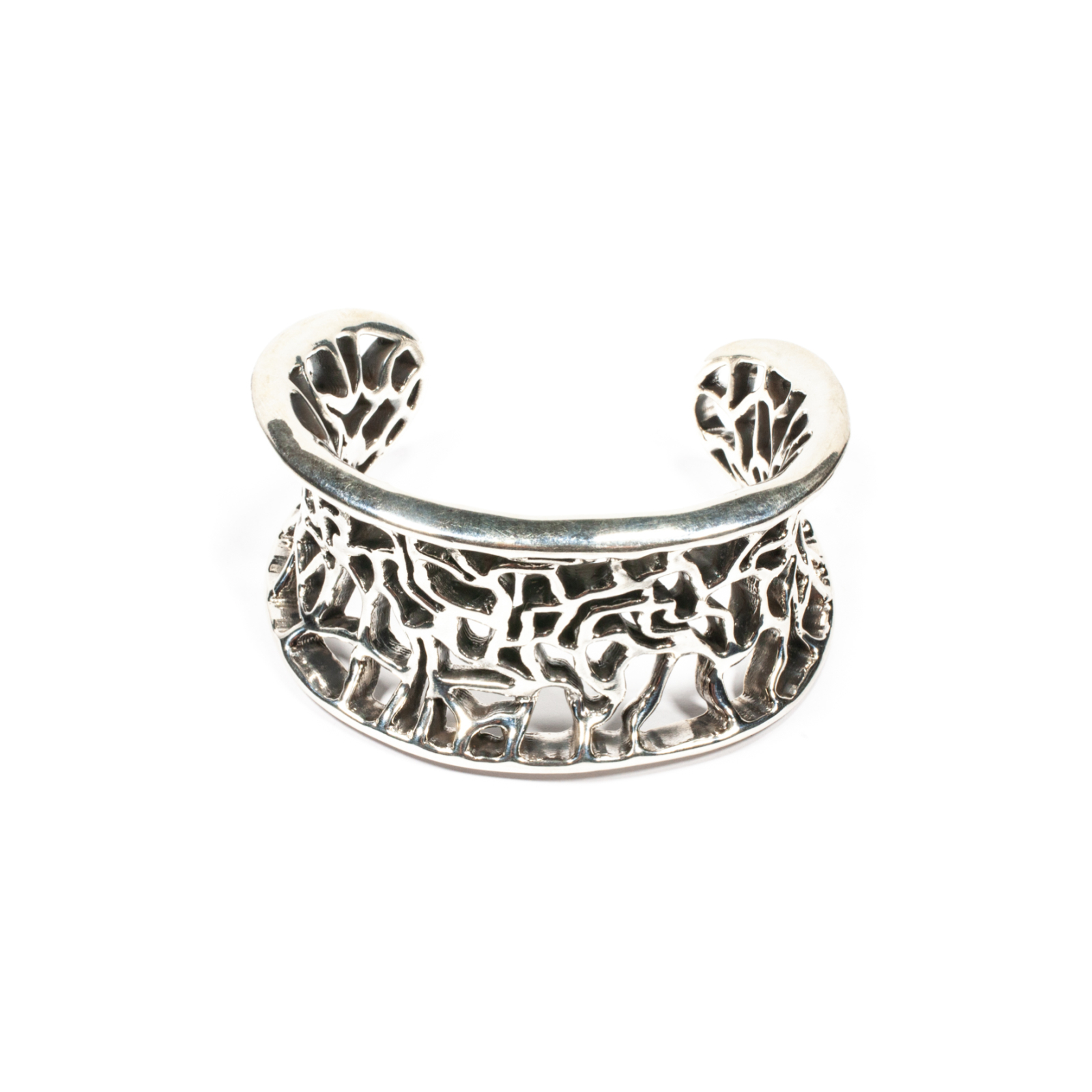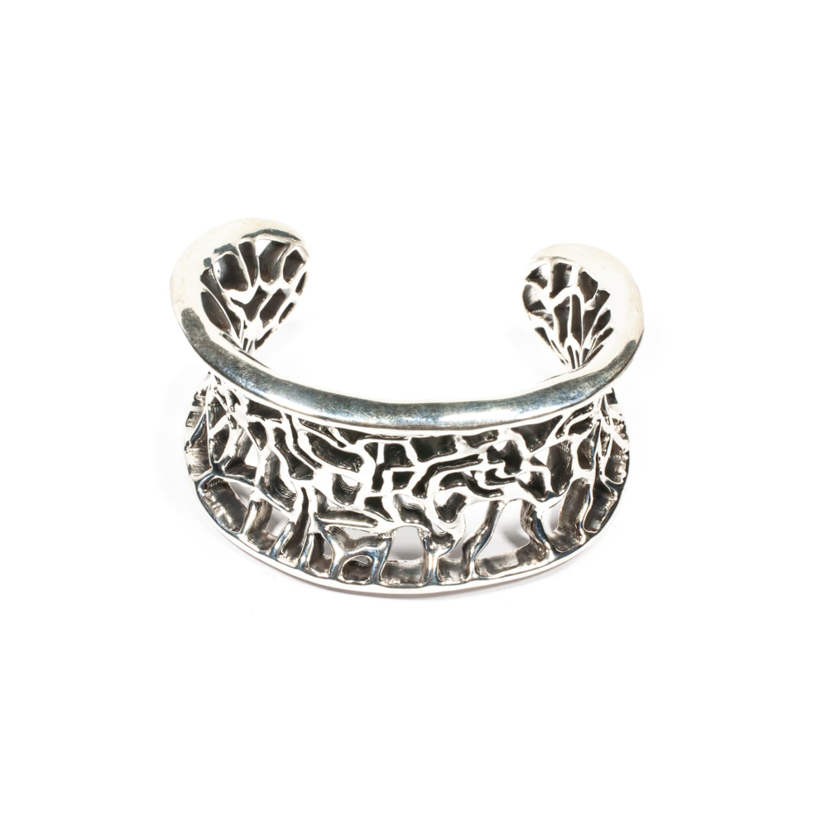 Brățară unicat din argint masiv, lucrată manual, tip cătușă. Realizată prin batere, cu textură distinctă și patinare fină, evidențiază eleganța stilului Art Nouveau. Confortabilă, se mulează ușor pe încheietură. O bijuterie statement, spectaculoasă și prețioasă. Pentru un ansamblu complet, puteți opta pentru cercei sau inel asortate, disponibile în colecțiile Sheba.