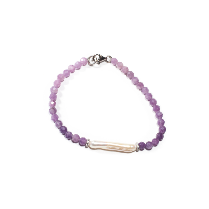 Brățară realizată manual în atelierele Sheba din pietre naturale, cu accesorii din argint. Brățara este realizată din pietre fațetate de kunzit de formă sferică, iar în centrul compoziției se evidențiază o perlă de cultură cu formă organică, ce adaugă un contrast rafinat și o notă de eleganță clasică. Accesoriile din argint completează armonios designul, conferind bijuteriei un aspect sofisticat și feminin. Pietrele sunt înșirate pe suport din oțel filetat acoperit cu peliculă de protecție, special creat pentru confecționarea bijuteriilor. Sistemul de prindere este tip carabină și la cerere se poate adăuga un lănțișor de prelungire. Pentru a vă accesoriza această brățară vă puteți comanda în funcție de preferințe și de ținuta la care doriți să o purtați, cercei sau colier în set.