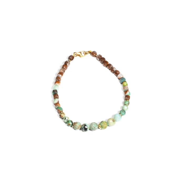 Brățară realizată manual în atelierele Sheba din pietre naturale, cu accesorii din argint auriu. Brățara este realizată din pietre fațetate de turcoaz de formă sferică și cubică. Pietrele sunt înșirate pe suport din oțel filetat acoperit cu peliculă de protecție, special creat pentru confecționarea bijuteriilor. Sistemul de prindere este tip carabină și la cerere se poate adăuga un lănțișor de prelungire. O bijuterie cu personalitate, potrivită ținutelor de seară sau pentru un accent rafinat peste zi. Pentru a vă accesoriza această brățară vă puteți comanda în funcție de preferințe și de ținuta la care doriți să o purtați, cercei sau colier în set.