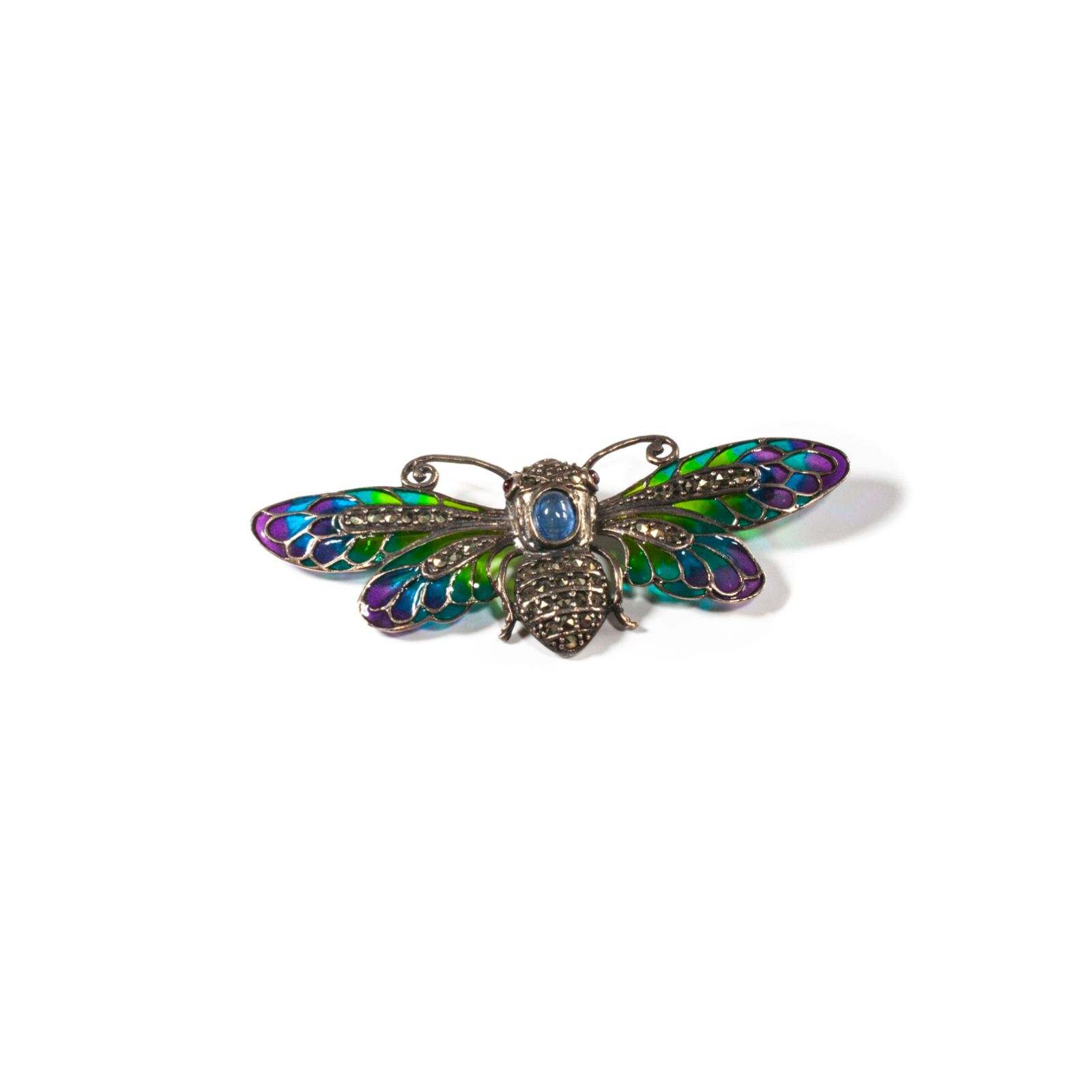 Broșă confecționată din argint în formă de libelulă, decorată cu email colorat și o piatră centrală de topaz albastru, alături de marcasite elvețiene. O broșă în culori vesele, de inspirație Art Nouveau, un cadou inspirat și accesibil, o bijuterie rafinată ce nu trebuie să lipsească de la reverul unei doamne.