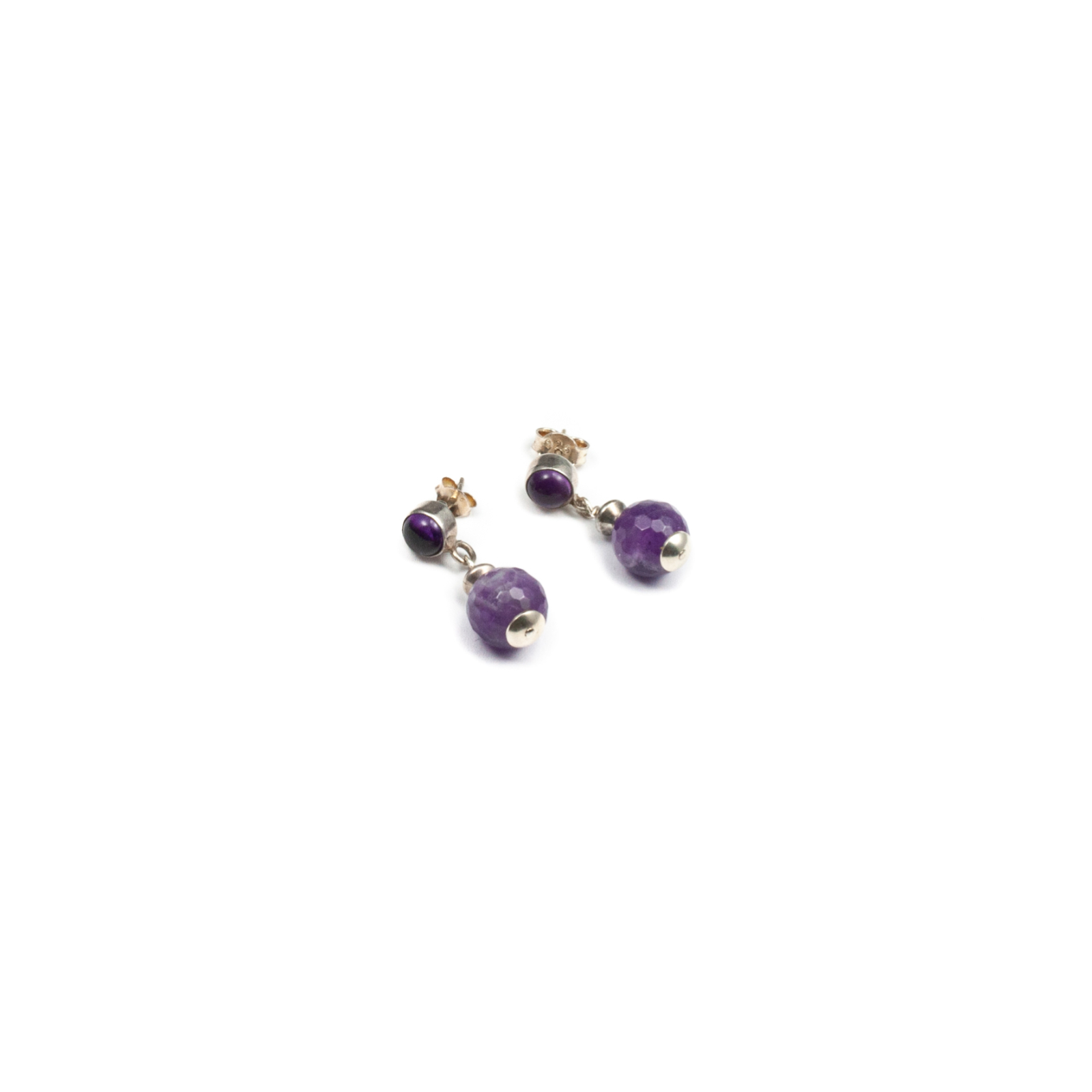 Cercei din pietre naturale cu argint, confectionați manual în atelierele Sheba. Cerceii sunt compuși din pietre fațetate de ametist de formă sferică și din pietre cu tăietură caboșon de ametist încasetate pe contur. Cerceii sunt prevăzuți cu sistem de prindere pe ureche tip tijă cu fluturaș, astfel se așază perfect pe lob și sunt comod de purtat. Cerceii reprezintă o bijuterie fină și elegantă, plină de energie și de culoare, fascinanți datorită balansului subtil al pietrelor. Pentru un ansamblu complet, puteți opta pentru brățară sau colier asortate, disponibile în colecțiile Sheba.