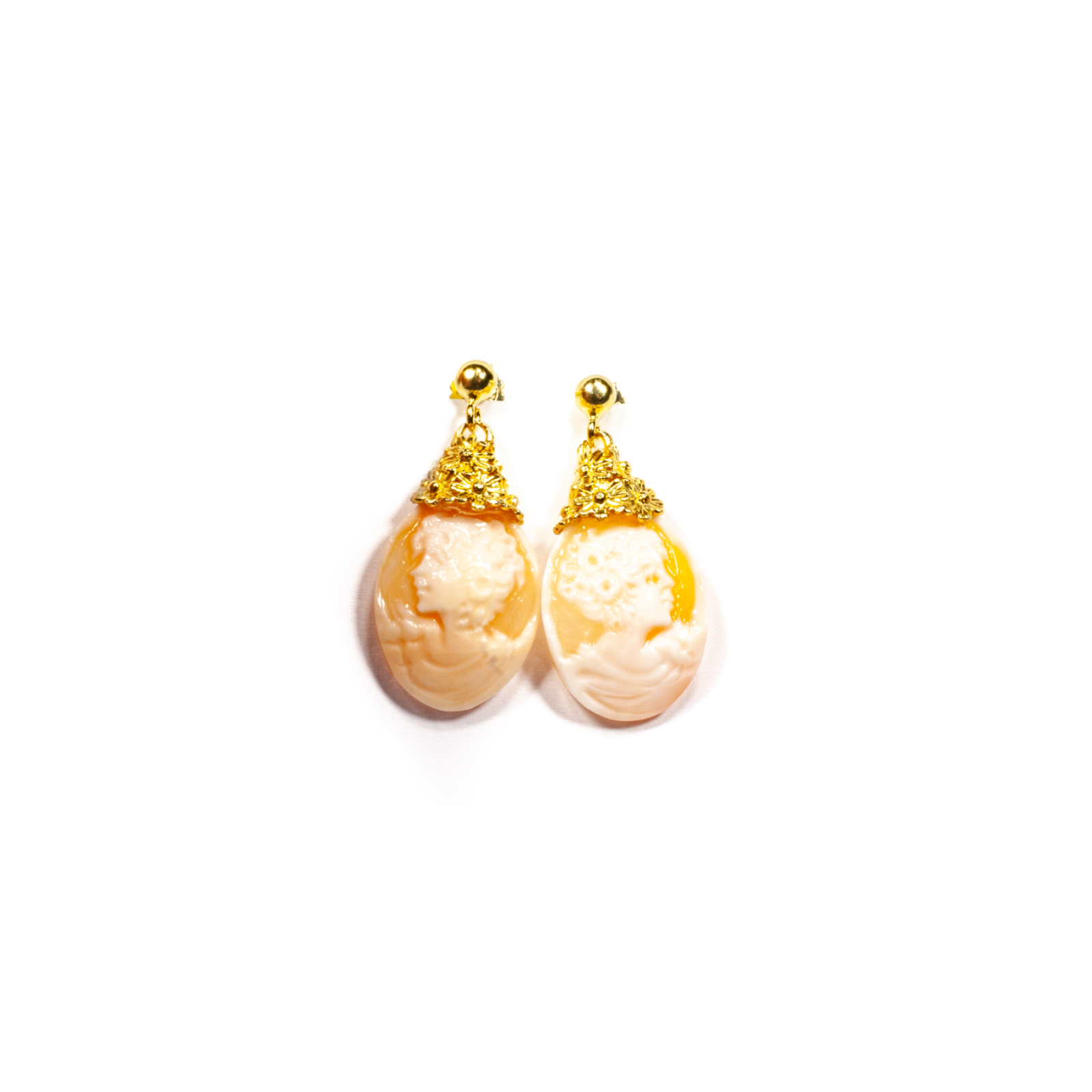 Cercei cu camee lucrată manual, pe scoică specială. Motura din argint auriu le oferă strălucire şi eleganţă, fără a concura cu splendoarea cameei. Cameele sunt scoici sculptate în relief, lucrate în miniatură. Acestea înfățișează portretul unei femei sau al unui zeu/ zeițe din mitologia greacă, ori romană. Ulterior au apărut motivele florale. Datorită frumuseții și eleganței, cameele au inspirat scriitori și sunt apreciate pentru farmecul lor și în zilele noastre. Cerceii sunt prevăzuți cu sistem de prindere pe ureche tip tijă cu fluturaș, astfel se așază perfect pe lob și sunt comod de purtat. Pentru un ansamblu complet, puteți opta pentru brățară sau colier asortate, disponibile în colecțiile Sheba.