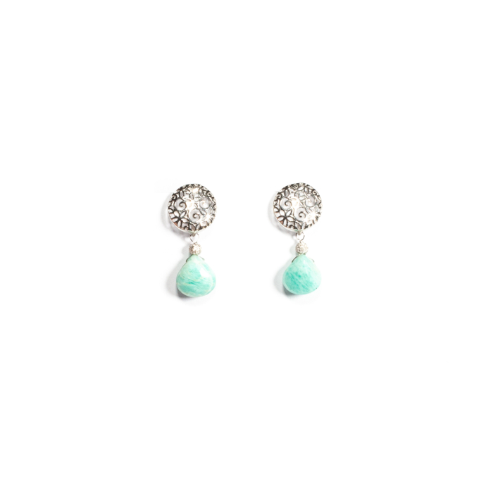 Cercei unicat, concept Ioana Condurățeanu, realizați manual în atelierele Sheba din pietre naturale, cu accesorii din argint. Cerceii conțin pietre fațetate de amazonit de formă lacrimă, suspendate sub o tortiță specială din argint, de formă rotundă. Cerceii sunt prevăzuți cu sistem de prindere pe ureche de tip tijă cu fluturaș, astfel se așază perfect pe lob și lasă piatra să se miște lejer. Bijuteria oferă o notă de serenitate și rafinament, potrivită atât pentru ținute smart-casual, cât și pentru evenimente elegante. Puteți cere ajutorul consilierilor Sheba pentru a vă comanda, în funcție de preferințe și de ținuta la care doriți să îi purtați, un pandantiv potrivit.