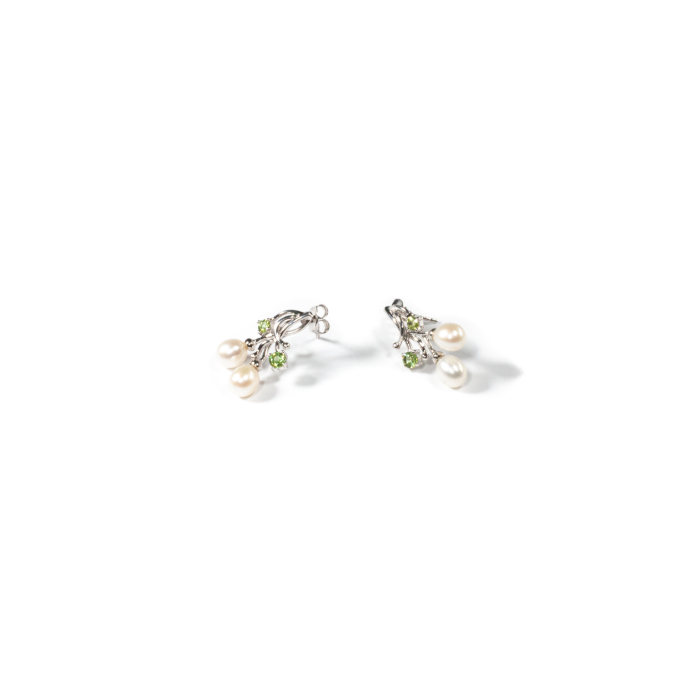 Cercei confecționați din argint ce conțin perle de cultură de formă ovală și mici pietre fațetate de peridot. Modelul și finisajul simplu și elegant scoate în evidență naturalețea și strălucirea pietrelor. Cerceii sunt prevăzuți cu sistem de prindere pe ureche tip tijă cu fluturaș, astfel se așază perfect pe lob și sunt comod de purtat. Pentru un ansamblu complet, puteți opta pentru brățară sau colier asortate, disponibile în colecțiile Sheba.