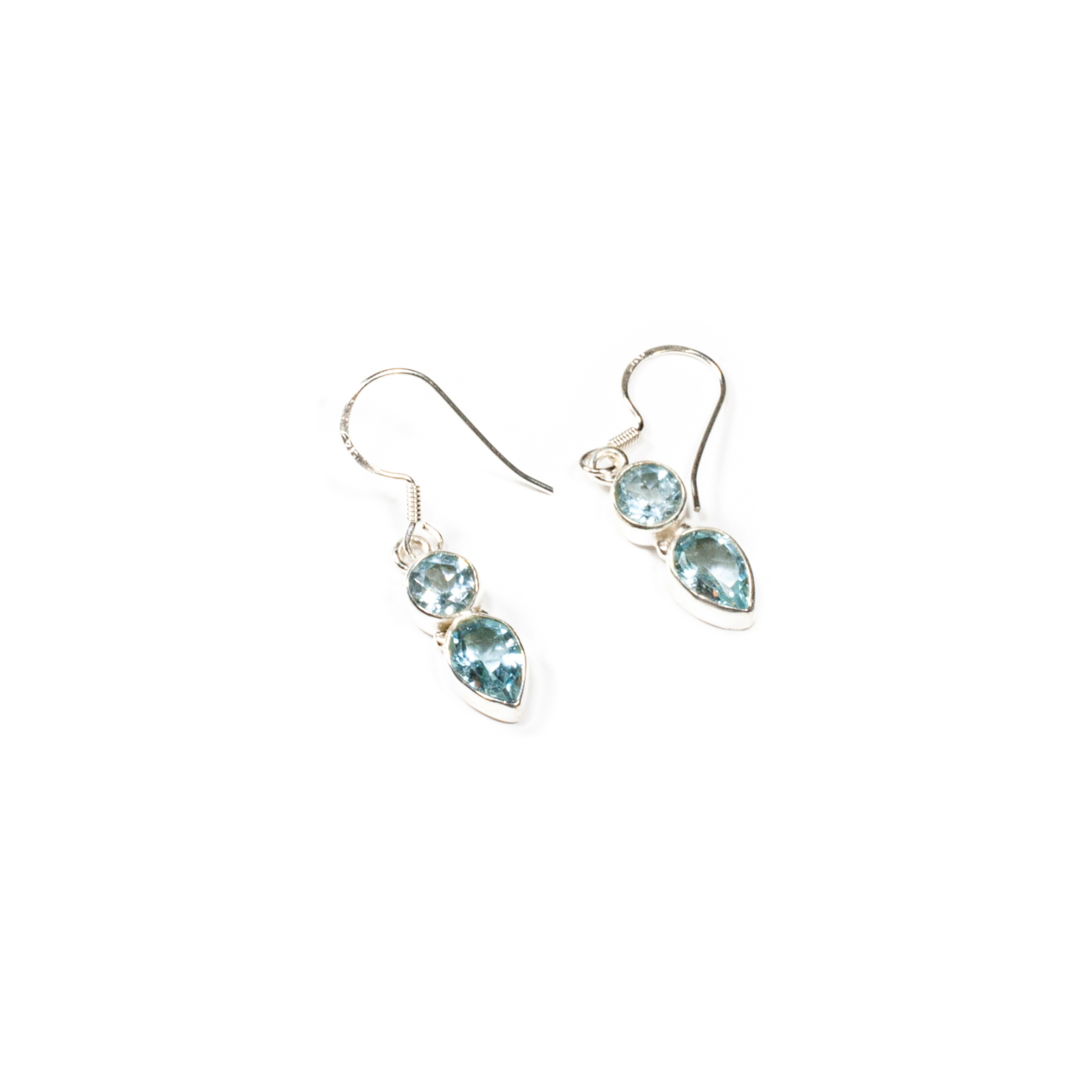 Cercei realizați manual din argint ce conțin pietre faţetate de topaz de formă rotundă şi lacrimă, încasetate pe contur. Cerceii sunt prevăzuți cu sistem de prindere pe ureche tip tortiță deschisă, astfel se așază perfect pe lob și sunt comod de purtat. Bijuteria oferă o notă de serenitate și rafinament, potrivită atât pentru ținute smart-casual, cât și pentru evenimente elegante. Puteți cere ajutorul consilierilor Sheba pentru a vă comanda, în funcție de preferințe și de ținuta la care doriți să îi purtați, un pandantiv potrivit.