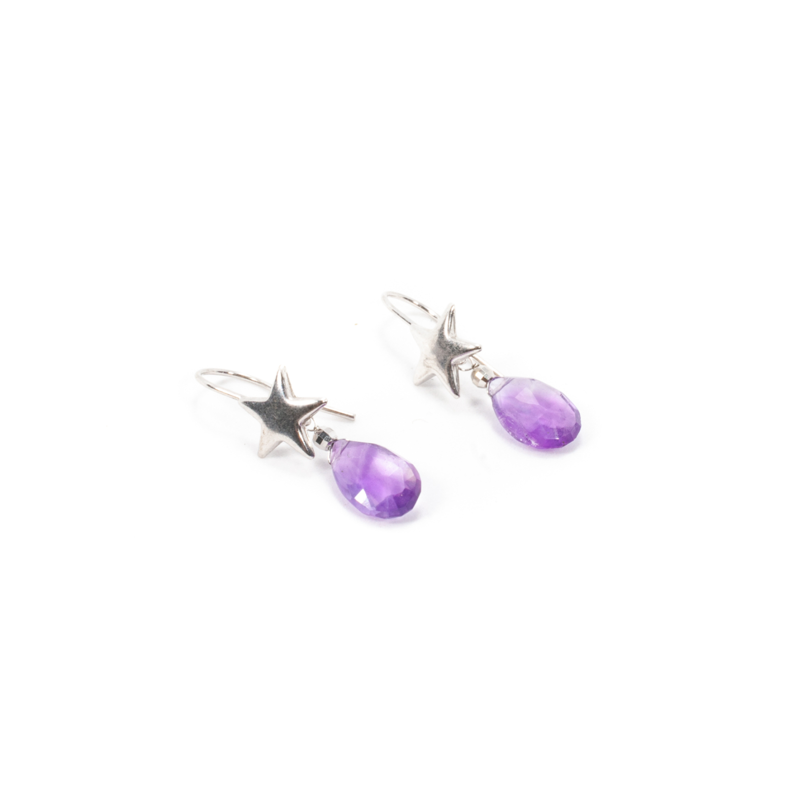 Cercei unicat, concept Ioana Condurățeanu, realizați manual în atelierele Sheba din pietre naturale, cu accesorii din argint. Cerceii sunt compuși din pietre fațetate de ametist de formă lacrimă, suspendate sub o tortiță specială cu model de steluță. Sistemul de prindere de tip tortiță deschisă fixează cerceii ușor și permite pietrei să se miște lejer. Bijuteria oferă o notă de serenitate și rafinament, potrivită atât pentru ținute smart-casual, cât și pentru evenimente elegante. Puteți cere ajutorul consilierilor Sheba pentru a vă comanda, în funcție de preferințe și de ținuta la care doriți să îi purtați, un pandantiv potrivit.