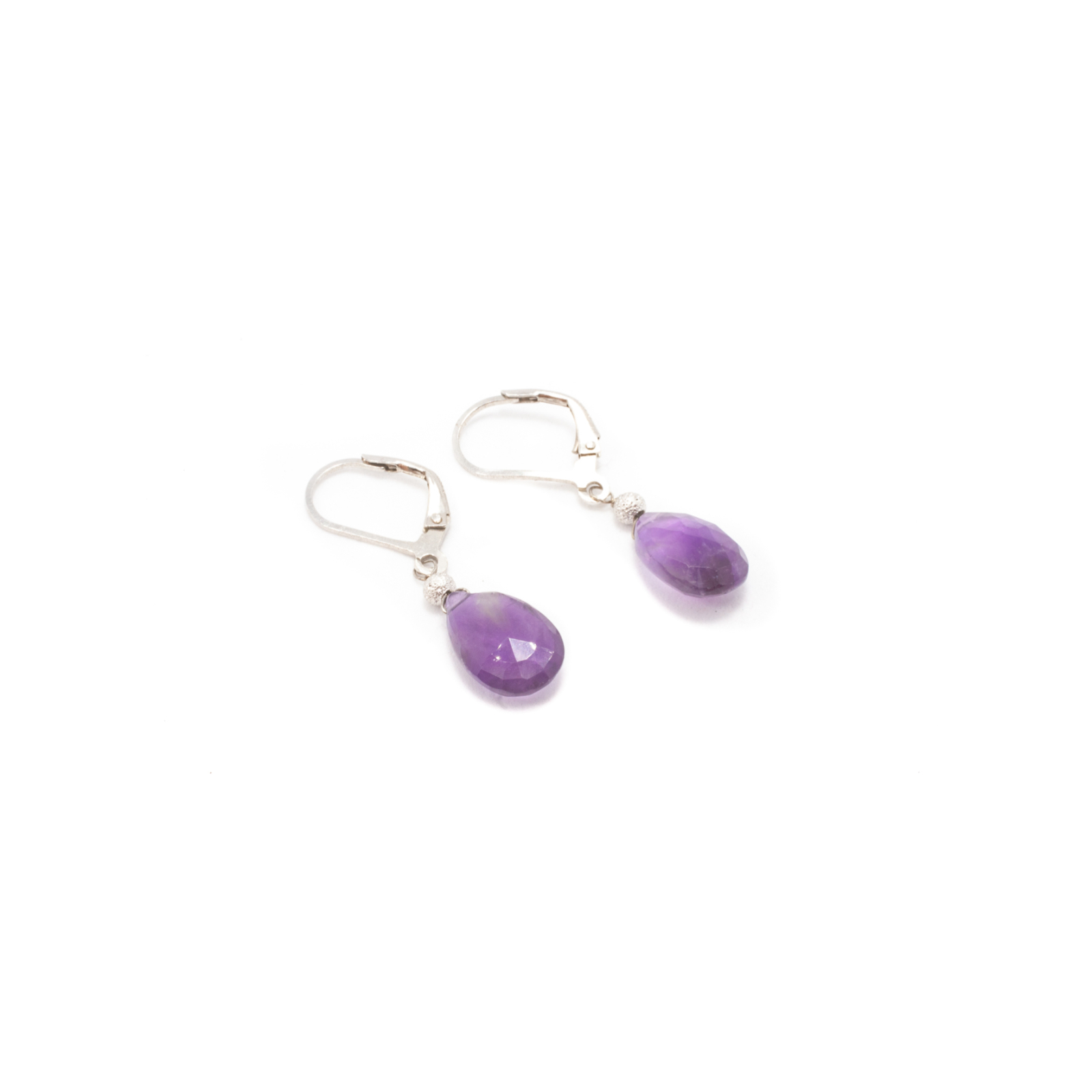 Cercei unicat, concept Ioana Condurățeanu, realizați manual în atelierele Sheba din pietre naturale, cu accesorii din argint. Cerceii sunt compuși din pietre fațetate de ametist, de formă lacrimă. Cerceii sunt prevăzuți cu sistem de prindere pe ureche de tip tortițe închise (lever-back), oferind un plus de sigurață și confort. Bijuteria oferă o notă de serenitate și rafinament, potrivită atât pentru ținute smart-casual, cât și pentru evenimente elegante. Puteți cere ajutorul consilierilor Sheba pentru a vă comanda, în funcție de preferințe și de ținuta la care doriți să îi purtați, un pandantiv potrivit.