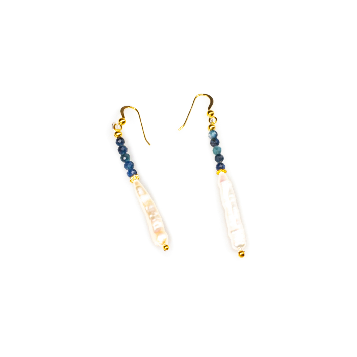 Cercei unicat, concept Ioana Condurățeanu, realizați manual în atelierele Sheba din pietre naturale, cu accesorii din argint. Cerceii conțin pietre fațetate de lapis lazuli de formă sferică și perle de cultură de formă alungită, suspendate sub tortiță delicată din argint auriu. Sistemul de prindere de tip tortiță deschisă fixează cerceii ușor și permite pietrelor să se miște lejer. Bijuteria oferă o notă de serenitate și rafinament, potrivită atât pentru ținute smart-casual, cât și pentru evenimente elegante. Puteți cere ajutorul consilierilor Sheba pentru a vă comanda, în funcție de preferințe și de ținuta la care doriți să îi purtați, un pandantiv potrivit.