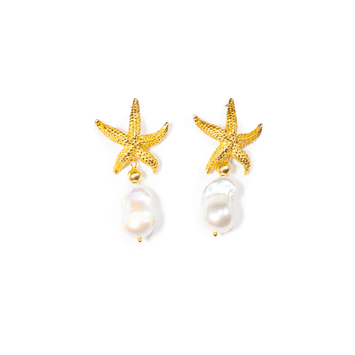 Cercei unicat, concept Ioana Condurățeanu, realizați manual în atelierele Sheba din pietre naturale, cu accesorii din argint auriu. Cerceii conțin perle baroc, suspendate sub o tortiță grațioasă din argint în formă de stea de mare. Cerceii sunt prevăzuți cu sistem de prindere pe ureche de tip tijă cu fluturaș, astfel se așază perfect pe lob și lasă piatra să se miște lejer. Bijuteria oferă o notă de serenitate și rafinament, potrivită atât pentru ținute smart-casual, cât și pentru evenimente elegante. Puteți cere ajutorul consilierilor Sheba pentru a vă comanda, în funcție de preferințe și de ținuta la care doriți să îi purtați, un pandantiv potrivit.