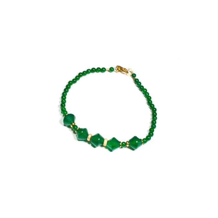 Brățară realizată manual în atelierele Sheba din pietre naturale, cu accesorii din argint auriu. Brățara este realizată din pietre fațetate și cu tăietură caboșon de agat verde de formă romboidală și sferică. Accesoriile din argint auriu completează armonios designul, conferind bijuteriei un aspect sofisticat și feminin. Pietrele sunt înșirate pe suport din oțel filetat acoperit cu peliculă de protecție, special creat pentru confecționarea bijuteriilor. Sistemul de prindere este tip carabină și la cerere se poate adăuga un lănțișor de prelungire. Pentru a vă accesoriza această brățară vă puteți comanda în funcție de preferințe și de ținuta la care doriți să o purtați, cercei sau colier în set.