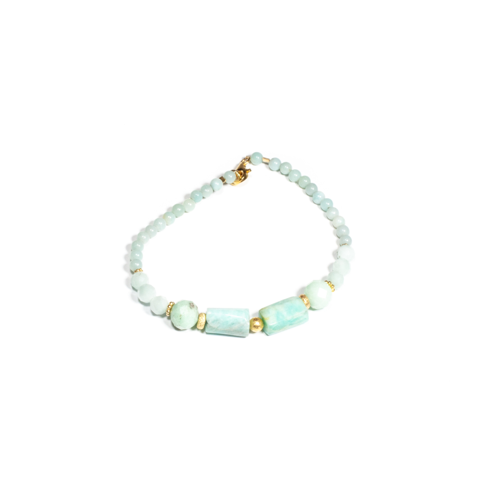 Brățară realizată manual în atelierele Sheba din pietre naturale, cu accesorii din argint auriu. Brățara este realizată din pietre fațetate și cu tăietură caboșon de amazonit de formă sferică și cilindrică. Accesoriile din argint auriu completează armonios designul, conferind bijuteriei un aspect sofisticat și feminin. Pietrele sunt înșirate pe suport din oțel filetat acoperit cu peliculă de protecție, special creat pentru confecționarea bijuteriilor. Sistemul de prindere este tip carabină și la cerere se poate adăuga un lănțișor de prelungire. Pentru a vă accesoriza această brățară vă puteți comanda în funcție de preferințe și de ținuta la care doriți să o purtați, cercei sau colier în set.