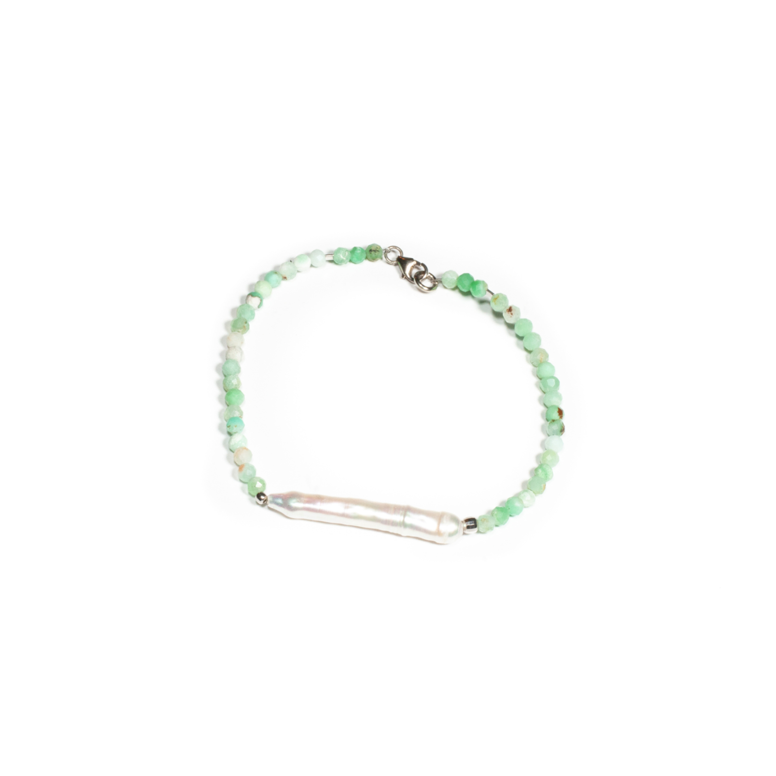 Brățară realizată manual în atelierele Sheba din pietre naturale, cu accesorii din argint. Brățara este realizată din pietre microfațetate de crisopraz de formă sferică, iar în centrul compoziției se evidențiază o perlă de cultură cu formă alungită, ce adaugă un contrast rafinat și o notă de eleganță clasică. Accesoriile din argint completează armonios designul, conferind bijuteriei un aspect sofisticat și feminin. Pietrele sunt înșirate pe suport din oțel filetat acoperit cu peliculă de protecție, special creat pentru confecționarea bijuteriilor. Sistemul de prindere este tip carabină și la cerere se poate adăuga un lănțișor de prelungire. Pentru a vă accesoriza această brățară vă puteți comanda în funcție de preferințe și de ținuta la care doriți să o purtați, cercei sau colier în set.