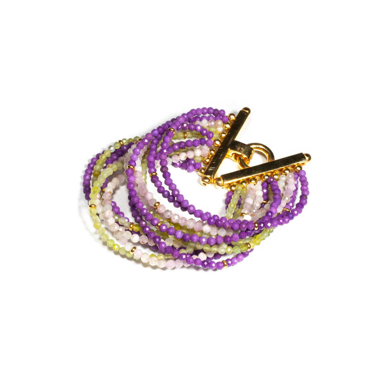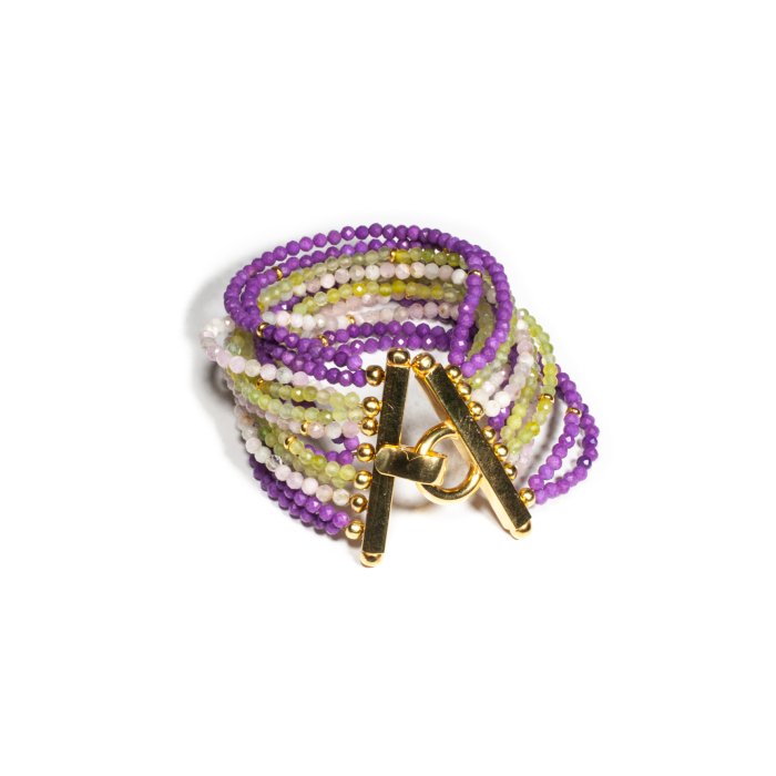 Brățară unicat, concept Ioana Condurățeanu, realizată manual în atelierele Sheba din pietre naturale, cu accesorii din argint masiv auriu. Brățara este compusă din mai multe fire ce conțin pietre fațetate de fosfosiderit, jad și kunzit de formă sferică. Încuietoarea robustă este din argint și aduce rafinament și eleganță acestei splendide bijuterii. Pietrele sunt înșirate pe suport din oțel filetat acoperit cu peliculă de protecție, special creat pentru confecționarea bijuteriilor. Pentru a vă accesoriza această brățară vă puteți comanda în funcție de preferințe și de ținuta la care doriți să o purtați, cercei sau colier în set.