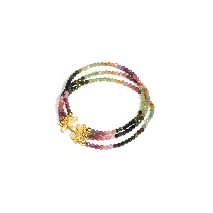 Brățară unicat, concept Ioana Condurățeanu, realizată manual în atelierele Sheba din pietre naturale, cu accesorii din argint. Brățara este compusă din trei fire ce conțin pietre fațetate de turmalină multicoloră de formă sferică. Încuietoarea decorativă din argint auriu acoperită cu mici zirconii fațetate aduce rafinament și eleganță acestei splendide bijuterii. Pietrele sunt înșirate pe suport din oțel filetat acoperit cu peliculă de protecție, special creat pentru confecționarea bijuteriilor. Pentru a vă accesoriza această brățară vă puteți comanda în funcție de preferințe și de ținuta la care doriți să o purtați, cercei sau colier în set.