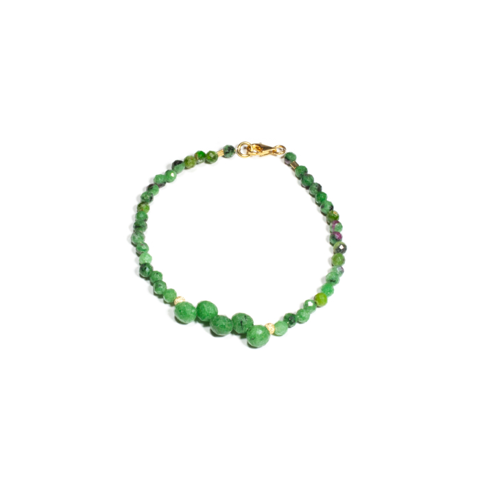 Brățară realizată manual în atelierele Sheba din pietre naturale, cu accesorii din argint auriu. Brățara este realizată din pietre fațetate de zoisit de formă sferică și briolete. Accesoriile din argint auriu completează armonios designul, conferind bijuteriei un aspect sofisticat și feminin. Pietrele sunt înșirate pe suport din oțel filetat acoperit cu peliculă de protecție, special creat pentru confecționarea bijuteriilor. Sistemul de prindere este tip carabină și la cerere se poate adăuga un lănțișor de prelungire. Pentru a vă accesoriza această brățară vă puteți comanda în funcție de preferințe și de ținuta la care doriți să o purtați, cercei sau colier în set.