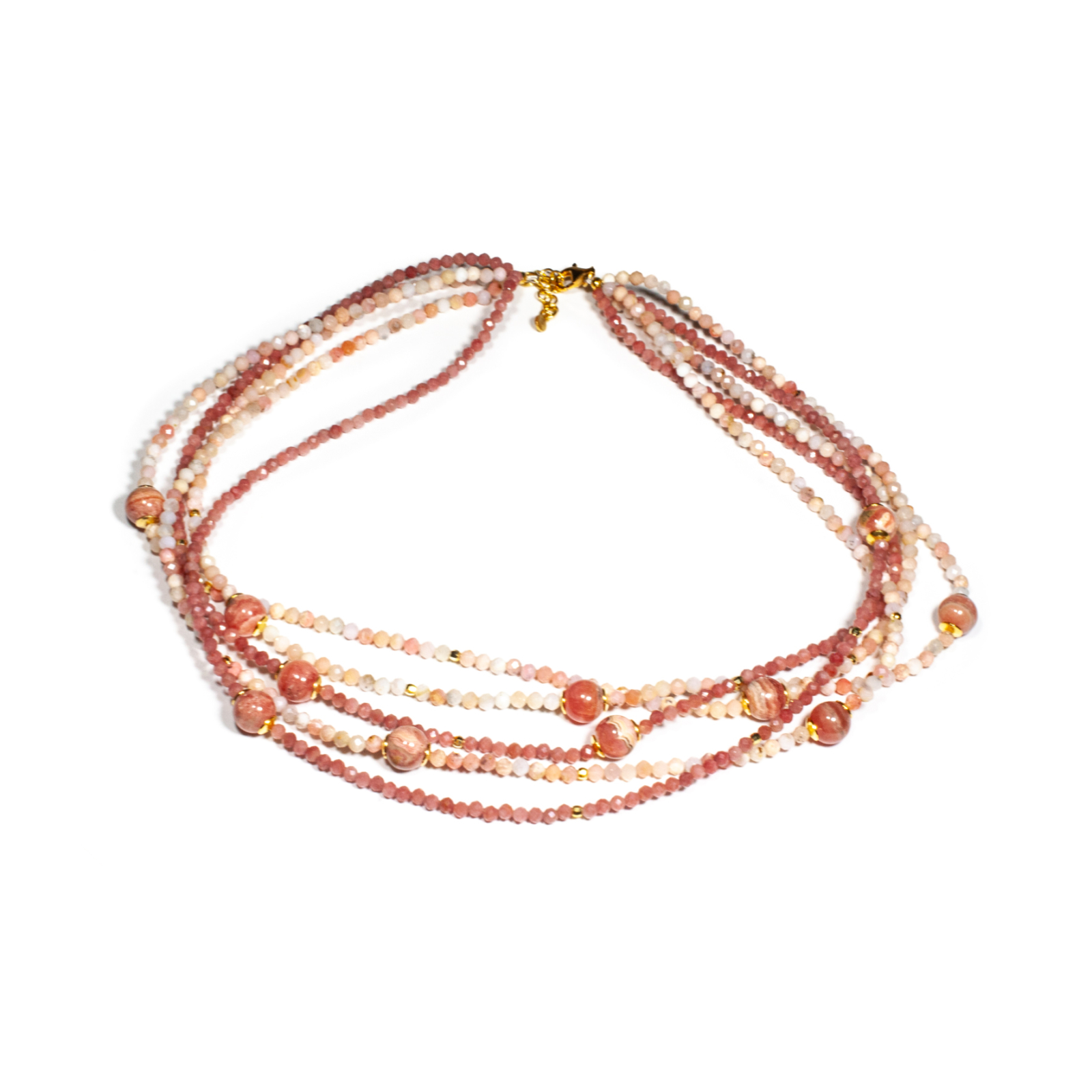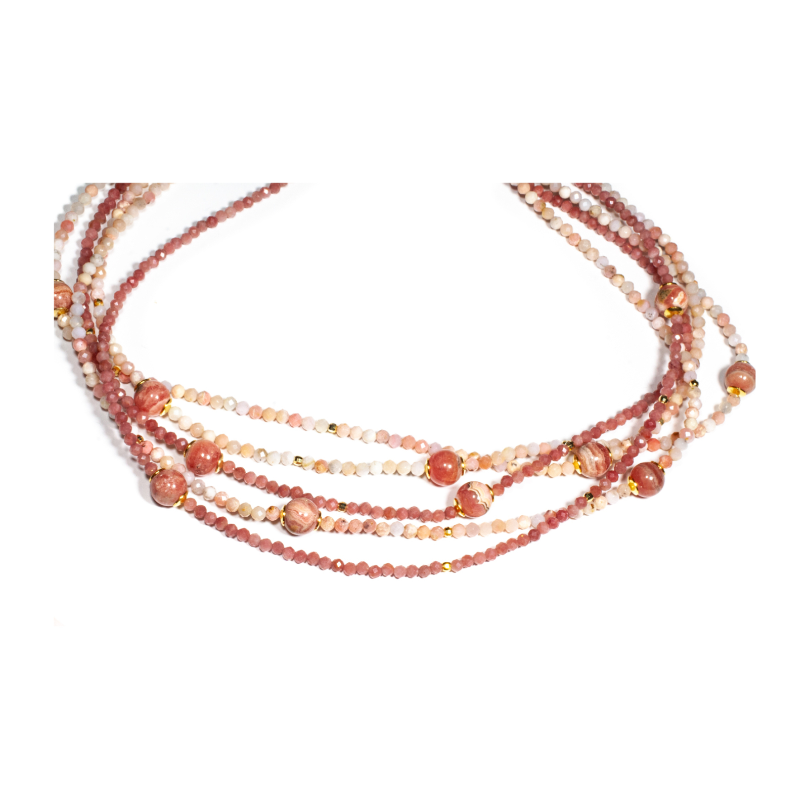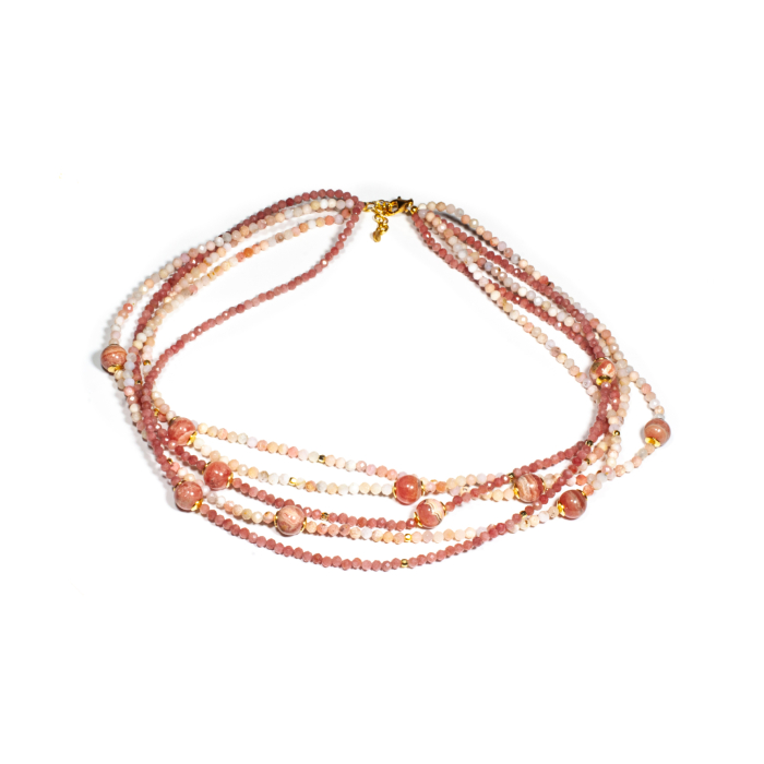 Colier unicat, concept Ioana Condurățeanu, realizat manual în atelierele Sheba din pietre naturale, cu accesorii din argint auriu. Colierul este compus din pietre fațetate de opal roz și piatra lunii roz de formă sferică, dispuse pe cinci fire ce curg armonios în jurul gâtului. Accesoriile din argint completează subtil designul, conferind bijuteriei un aspect sofisticat și feminin. Pietrele sunt înșirate pe suport din oțel filetat acoperit cu peliculă de protecție, special creat pentru confecționarea bijuteriilor. Sistemul de închidere este de tip carabină, discretă și sigură. Colierul se poate ajusta ca lungime având lanț de prelungire, pentru a se putea adapta perfect în funcție de preferința dumneavoastră. O bijuterie cu personalitate, potrivită ținutelor de seară sau pentru un accent rafinat peste zi. Pentru a vă accesoriza acest colier vă puteți comanda în funcție de preferințe și ținuta la care doriți să îl purtați, cercei sau brățară în același ton.