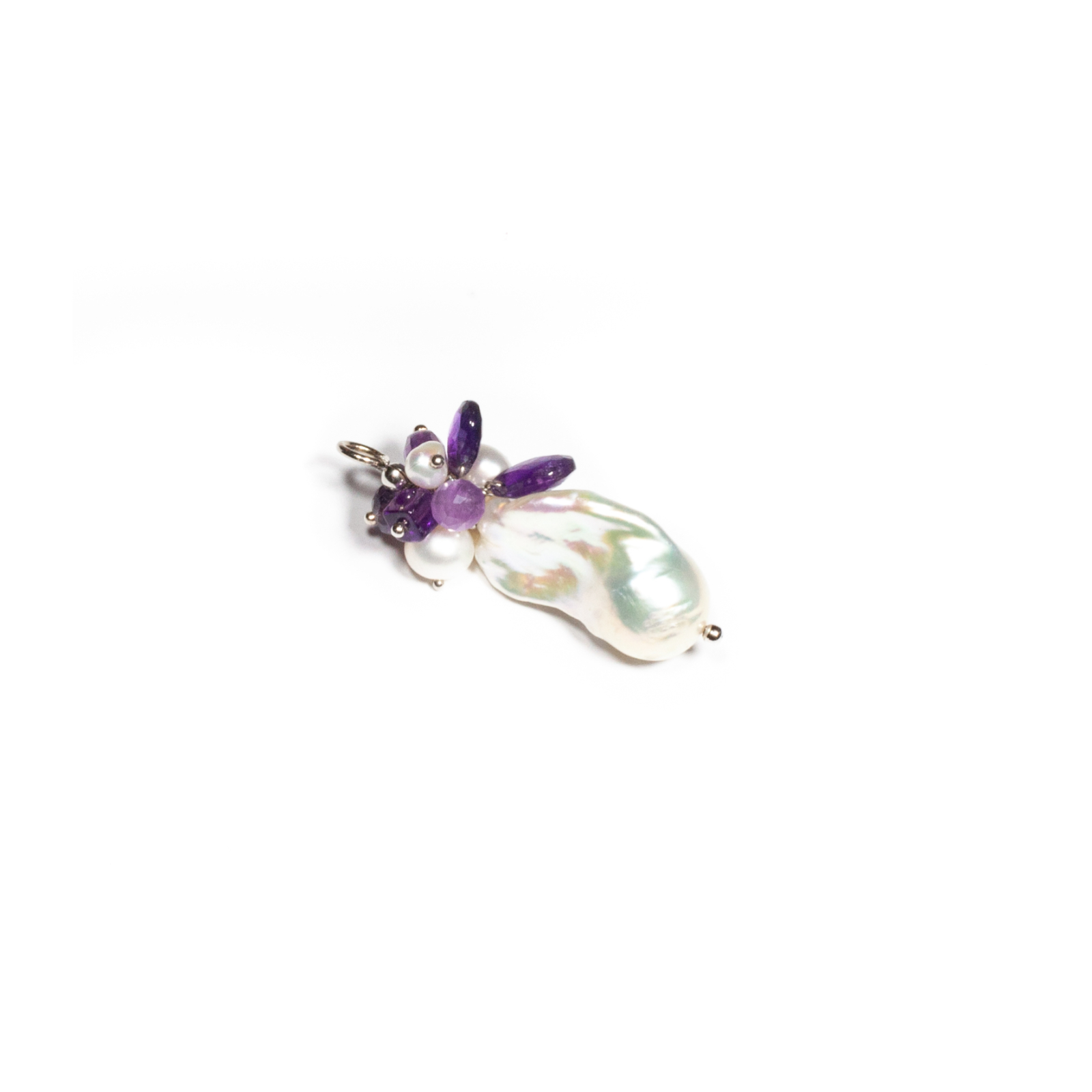 Pandantiv unicat, concept Ioana Condurățeanu, realizat manual în atelierele Sheba din pietre naturale, cu accesorii din argint. Pandantivul îmbină o perlă baroc cu pietre fațetate de ametist în formă de lacrimă și briolete, alături de perle de cultură sferice. Pentru un ansamblu complet, puteți opta pentru cercei sau brățară asortate, disponibile în colecțiile Sheba. De asemenea, puteți alege și un lanț potrivit pentru acest pandantiv.