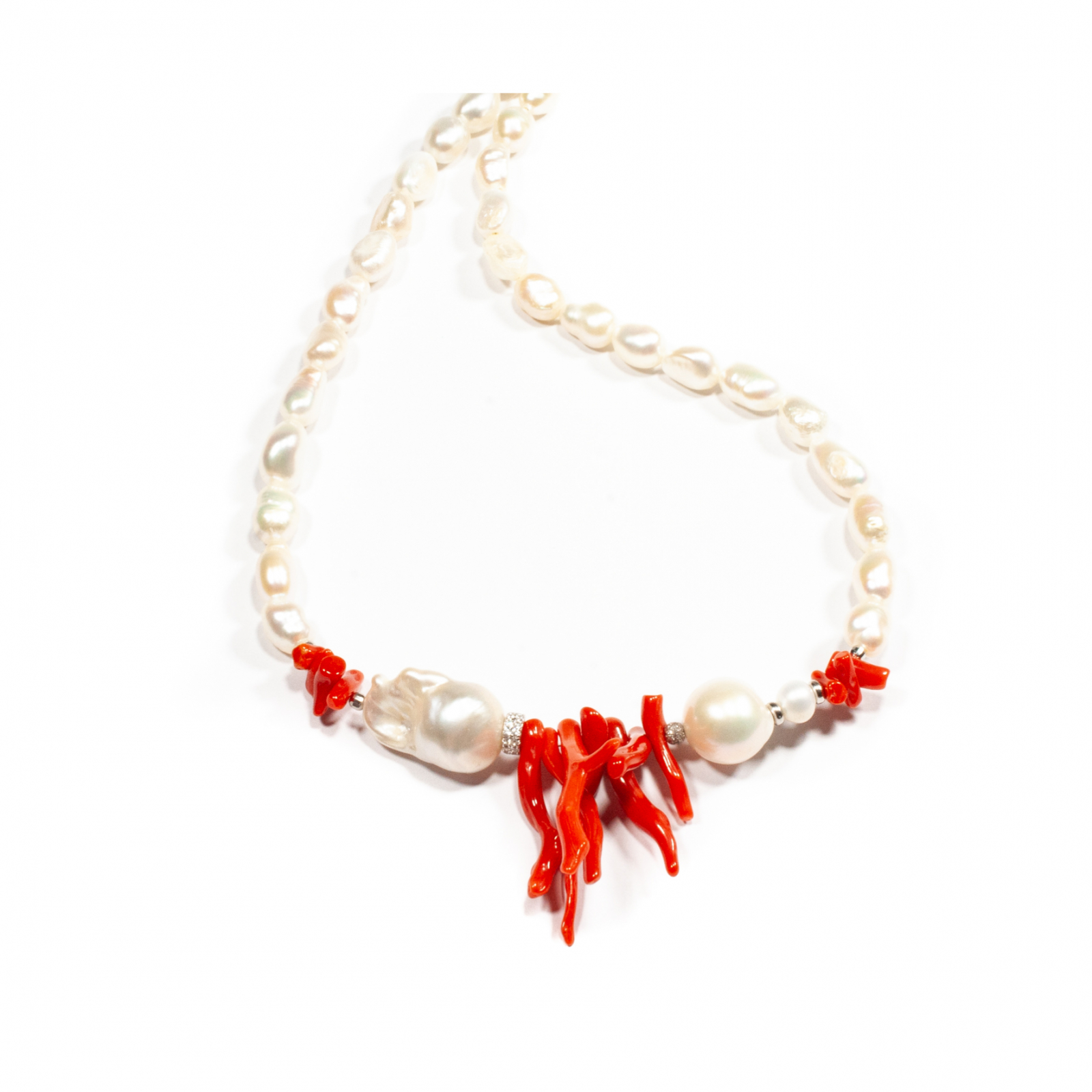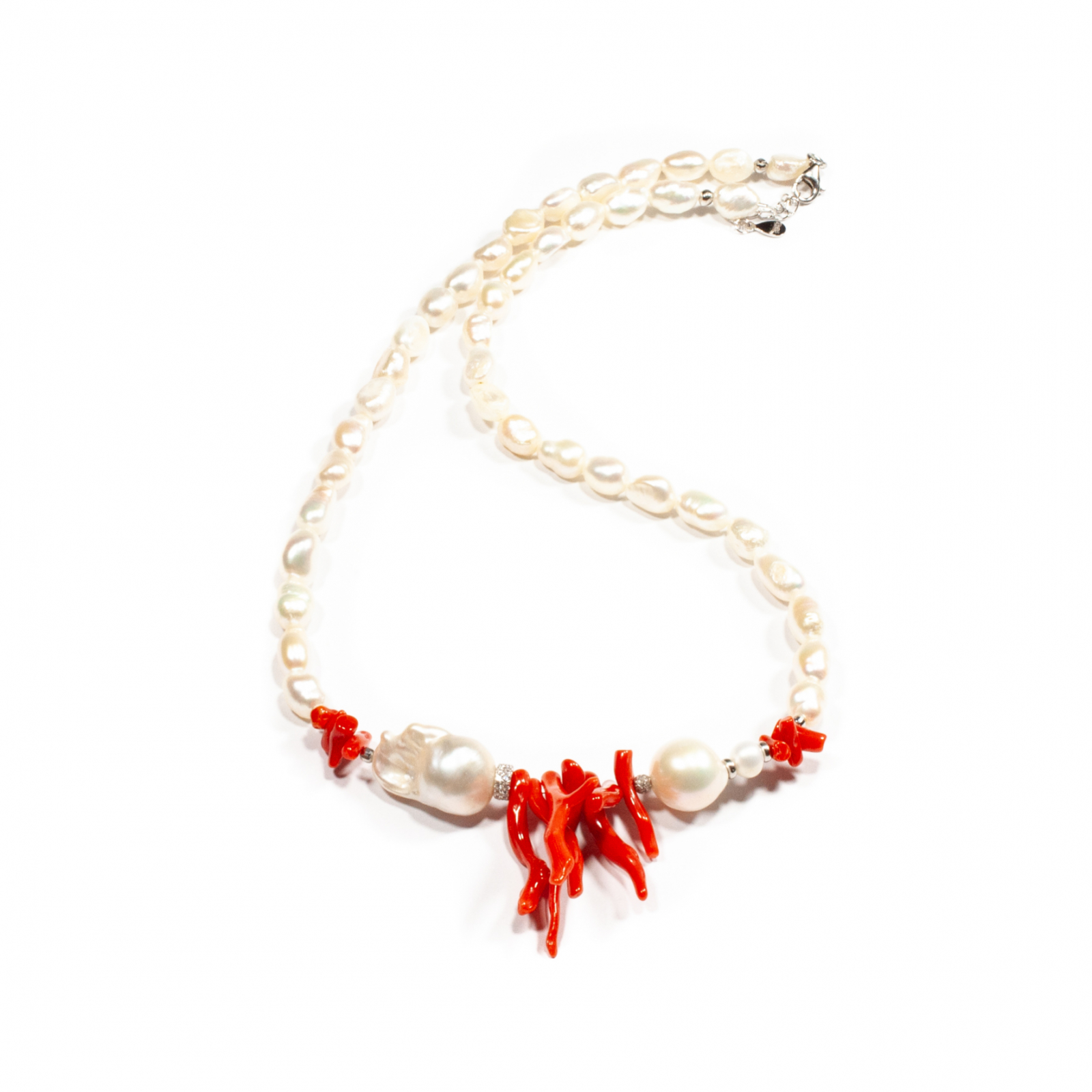 O bijuterie de inspirație mediteraneană, în care roșul intens al coralului este temperat de lumina caldă a perlei baroc. Argintul adaugă un accent discret, făcând din acest colier o alegere rafinată pentru ținute simple, de vară.
