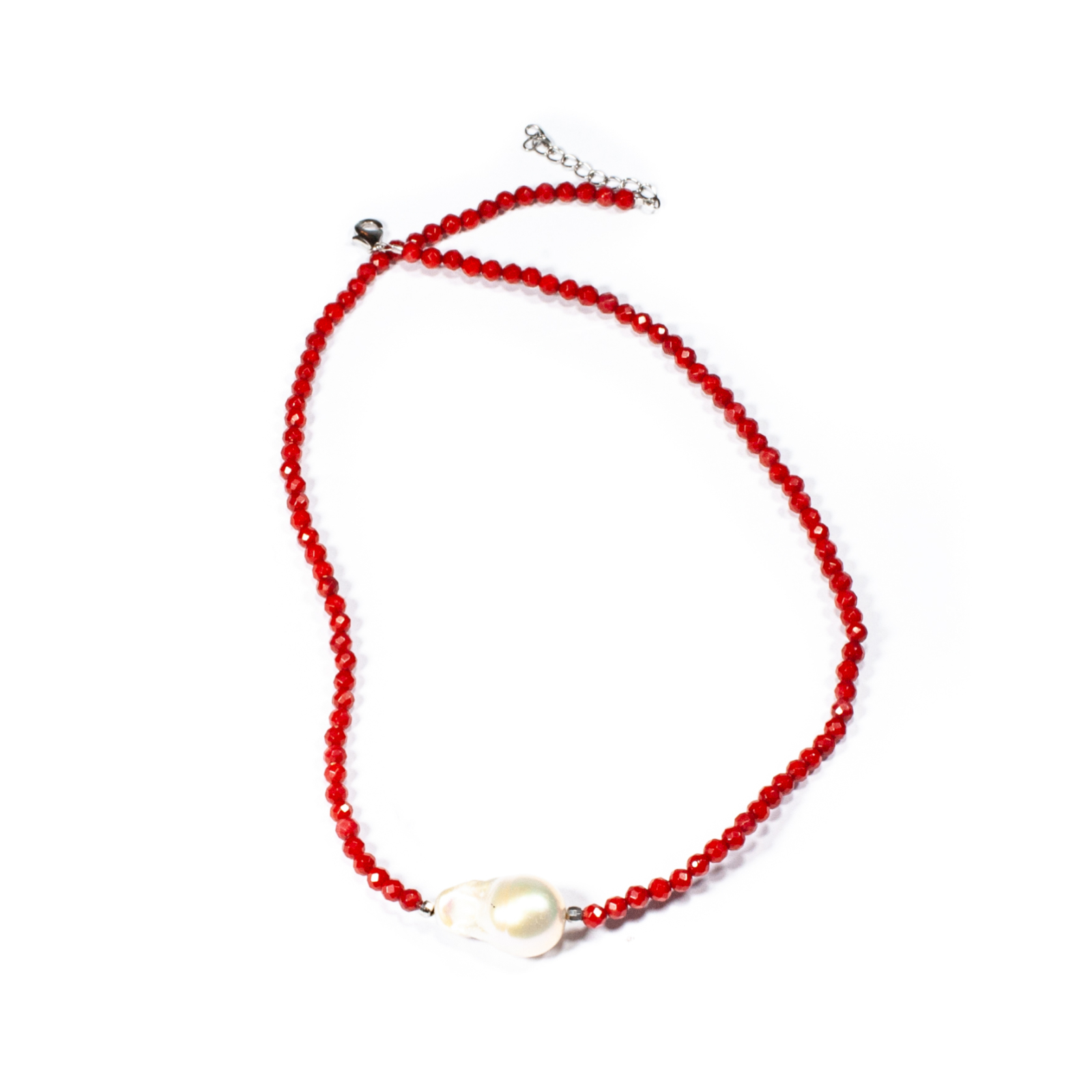 Colier unicat, concept Ioana Condurățeanu, realizat manual în atelierele Sheba din pietre naturale, cu accesorii din argint. Colierul este compus din pietre fațetate de coral de formă sferică de 3 mm diametru și dintr-o perlă baroc ca punct de accent, dispusă central. Pietrele sunt înșirate pe suport din oțel filetat acoperit cu peliculă de protecție, special creat pentru confecționarea bijuteriilor. Sistemul de închidere este de tip carabină, discretă și sigură. O bijuterie cu personalitate, potrivită ținutelor de seară sau pentru un accent rafinat peste zi. Pentru a vă accesoriza acest colier vă puteți comanda în funcție de preferințe și ținuta la care doriți să îl purtați, cercei sau brățară în același ton.