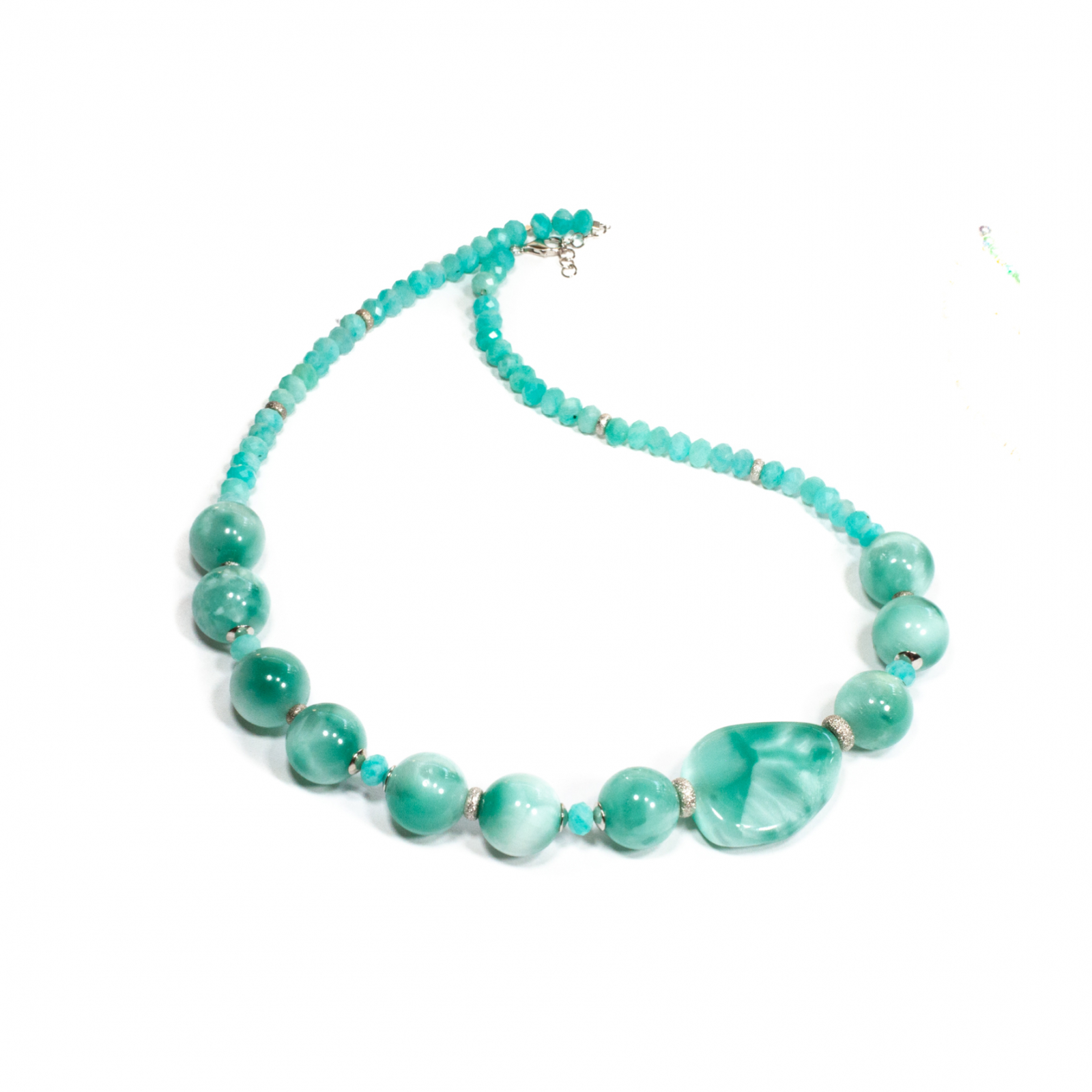 Colier unicat, concept Ioana Condurățeanu, realizat manual în atelierele Sheba din pietre naturale, cu accesorii din argint rodiat. Colierul este compus din pietre fațetate de amazonit de formă sferă turtită și din pietre cu tăietură caboșon de angelit compozit de formă sferică și aproximativ ovală. Pietrele sunt înșirate pe suport din oțel filetat acoperit cu peliculă de protecție, special creat pentru confecționarea bijuteriilor. Accesoriile din argint sunt acoperite cu un strat fin de rodiu care le protejează împotriva zgârieturilor și oxidării, menținându-le strălucirea pentru o perioadă îndelungată. Sistemul de închidere este de tip carabină, discretă și sigură. Colierul se poate ajusta ca lungime având lanț de prelungire, pentru a se putea adapta perfect în funcție de preferința dumneavoastră. O bijuterie cu personalitate, potrivită ținutelor de seară sau pentru un accent rafinat peste zi. Pentru a vă accesoriza acest colier vă puteți comanda în funcție de preferințe și ținuta la care doriți să îl purtați, cercei sau brățară în set.