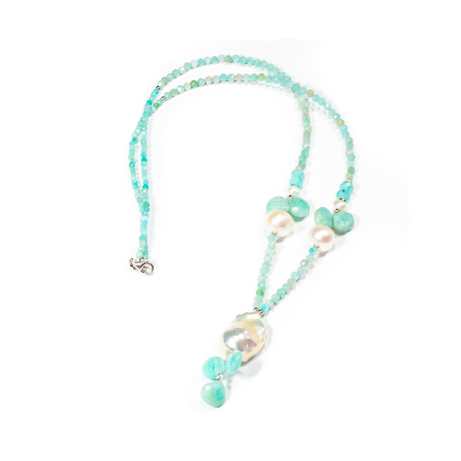 Colier unicat, concept Ioana Condurățeanu, realizat manual în atelierele Sheba din pietre naturale, cu accesorii din argint. Colierul este compus din pietre fațetate de aamazonit de formă sferică și lacrimă și din perle de cultură de formă sferică. În zona centrală colierul conține o perlă baroc ce adaugă o notă de eleganță clasică. Pietrele sunt înșirate pe suport din oțel filetat acoperit cu peliculă de protecție, special creat pentru confecționarea bijuteriilor. Sistemul de închidere este de tip carabină, discretă și sigură. Colierul reprezintă o bijuterie fină și elegantă, plină de energie și culoare. Pentru a vă accesoriza acest colier vă puteți comanda în funcție de preferințe și ținuta la care doriți să îl purtați, cercei sau brățară în set.