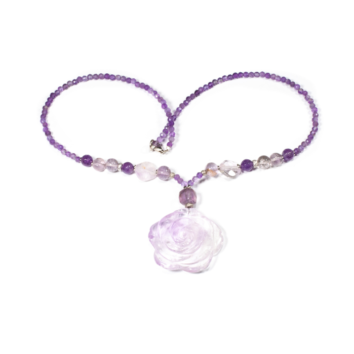 Colier unicat, concept Ioana Condurățeanu, realizat manual în atelierele Sheba din pietre naturale, cu accesorii din argint 92,5% provenit din Italia. Colierul este compus din ametist, o piatră naturală apreciată pentru nuanțele sale elegante și profunde, atent aleasă pentru rafinamentul și luminozitatea discretă a compoziției. Pietrele sunt înșirate pe suport din oțel filetat acoperit cu peliculă de protecție, special creat pentru confecționarea bijuteriilor. Sistemul de închidere este de tip carabină, discretă și sigură. Colierul are lungimea de 46 cm și conține 1,50 g argint. Colierul reprezintă o bijuterie rafinată, feminină și elegantă, potrivită atât pentru ținute de zi, cât și pentru apariții mai speciale. Pentru a vă accesoriza acest colier, vă puteți comanda, în funcție de preferințe și de ținuta la care doriți să îl purtați, o brățară sau cercei în set.