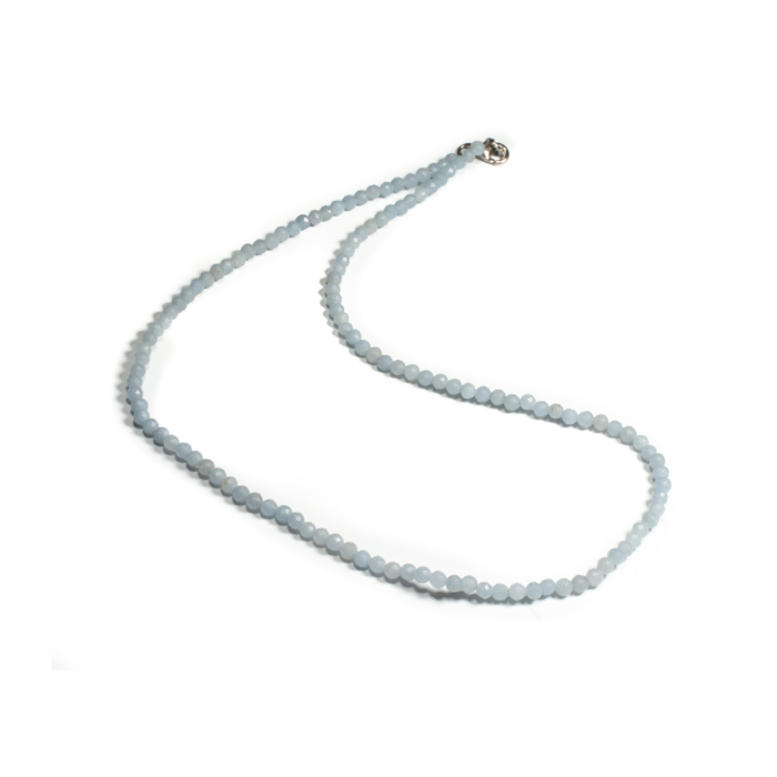 Colier unicat, concept Ioana Condurățeanu, realizat manual în atelierele Sheba din pietre naturale, cu accesorii din argint. Colierul este realizat din pietre fațetate de angelit de formă sferică. Pietrele sunt înșirate pe suport din oțel filetat acoperit cu peliculă de protecție, special creat pentru confecționarea bijuteriilor. Sistemul de închidere este de tip carabină, discretă și sigură. O bijuterie cu personalitate, potrivită ținutelor de seară sau pentru un accent rafinat peste zi. Pentru a vă accesoriza acest colier vă puteți comanda în funcție de preferințe și ținuta la care doriți să îl purtați, cercei sau brățară în același ton.