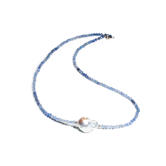 Colier unicat, concept Ioana Condurățeanu, realizat manual în atelierele Sheba din pietre naturale, cu accesorii din argint. Colierul este compus din pietre fațetate de angelit de formă sferică și dintr-o perlă baroc ca punct de accent, dispusă central. Pietrele sunt înșirate pe suport din oțel filetat acoperit cu peliculă de protecție, special creat pentru confecționarea bijuteriilor. Sistemul de închidere este de tip carabină, discretă și sigură. O bijuterie cu personalitate, potrivită ținutelor de seară sau pentru un accent rafinat peste zi. Pentru a vă accesoriza acest colier vă puteți comanda în funcție de preferințe și ținuta la care doriți să îl purtați, cercei sau brățară în același ton.