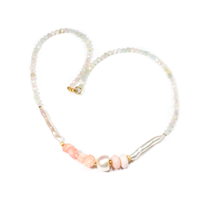 Colier unicat, concept Ioana Condurățeanu, realizat manual în atelierele Sheba din pietre naturale, cu accesorii din argint 92,5% provenit din Italia. Colierul este compus din coral, opal și perle de cultură, o combinație rafinată de pietre naturale, în care tonurile calde ale coralului sunt completate de irizațiile delicate ale opalului și de eleganța clasică a perlelor. Pietrele sunt înșirate pe suport din oțel filetat acoperit cu peliculă de protecție, special creat pentru confecționarea bijuteriilor. Sistemul de închidere este de tip carabină, discretă și sigură. Colierul are lungimea de 43,5 cm și conține 1,30 g argint. Colierul reprezintă o bijuterie luminoasă, elegantă și plină de feminitate, ideală pentru a completa ținutele cu un detaliu delicat și sofisticat. Pentru a vă accesoriza acest colier, vă puteți comanda, în funcție de preferințe și de ținuta la care doriți să îl purtați, o brățară sau cercei în set.