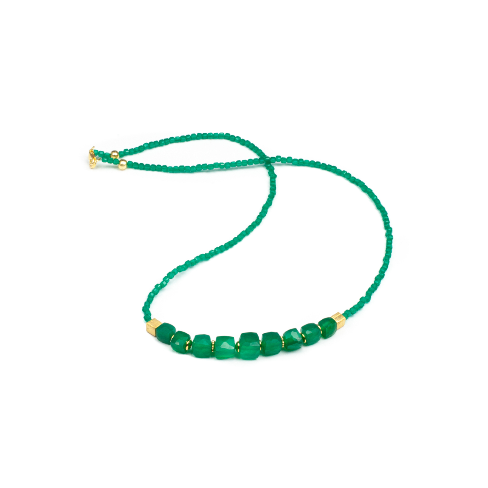Colier unicat, concept Ioana Condurățeanu, realizat manual în atelierele Sheba din pietre naturale, cu accesorii din argint auriu. Colierul este compus din pietre fațetate de agat verde de formă rectangulară. Pietrele sunt înșirate pe suport din oțel filetat acoperit cu peliculă de protecție, special creat pentru confecționarea bijuteriilor. Sistemul de închidere este de tip carabină, discretă și sigură. O bijuterie cu personalitate, potrivită ținutelor de seară sau pentru un accent rafinat peste zi. Pentru a vă accesoriza acest colier vă puteți comanda în funcție de preferințe și ținuta la care doriți să îl purtați, cercei sau brățară în același ton.