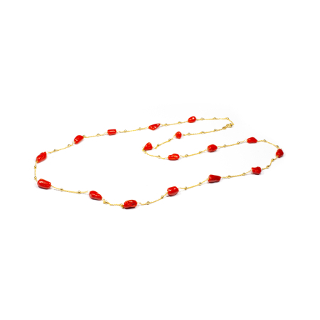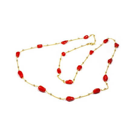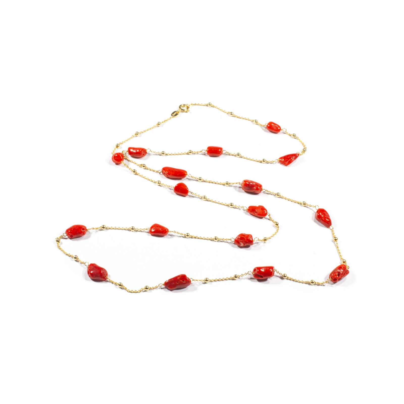 Colier unicat, concept Ioana Condurățeanu, realizat manual în atelierele Sheba din pietre naturale și lanț din argint. Colierul este alcătuit dintr-un lanț din zale fine din argint auriu cu bobițe ce conține pietre cu tăietură caboșon de coral de formă aproximativ ovală. Contrastul dintre argint și pietrele naturale creează un design modern, echilibrat și versatil. Lungimea colierului și sistemul de închidere de tip carabină permite purtarea lui atât lung, cât și scurt, în jurul gâtului. O bijuterie cu personalitate, potrivită ținutelor de seară sau pentru un accent rafinat peste zi. Pentru a vă accesoriza acest colier vă puteți comanda în funcție de preferințe și ținuta la care doriți să îl purtați, cercei sau brățară în set.