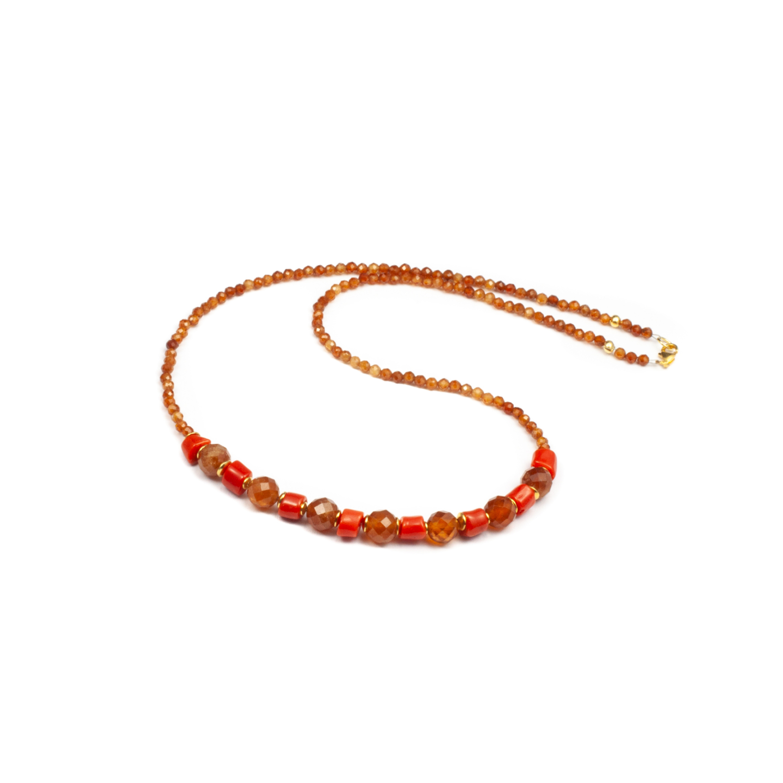 Colier unicat, concept Ioana Condurățeanu, realizat manual în atelierele Sheba din pietre naturale, cu accesorii din argint auriu. Colierul este compus din pietre fațetate de granat de formă sferică și din baghete de coral roșu. Pietrele sunt înșirate pe suport din oțel filetat acoperit cu peliculă de protecție, special creat pentru confecționarea bijuteriilor. Sistemul de închidere este de tip carabină, discretă și sigură. O bijuterie cu personalitate, potrivită ținutelor de seară sau pentru un accent rafinat peste zi. Pentru a vă accesoriza acest colier vă puteți comanda în funcție de preferințe și ținuta la care doriți să îl purtați, cercei sau brățară în același ton.