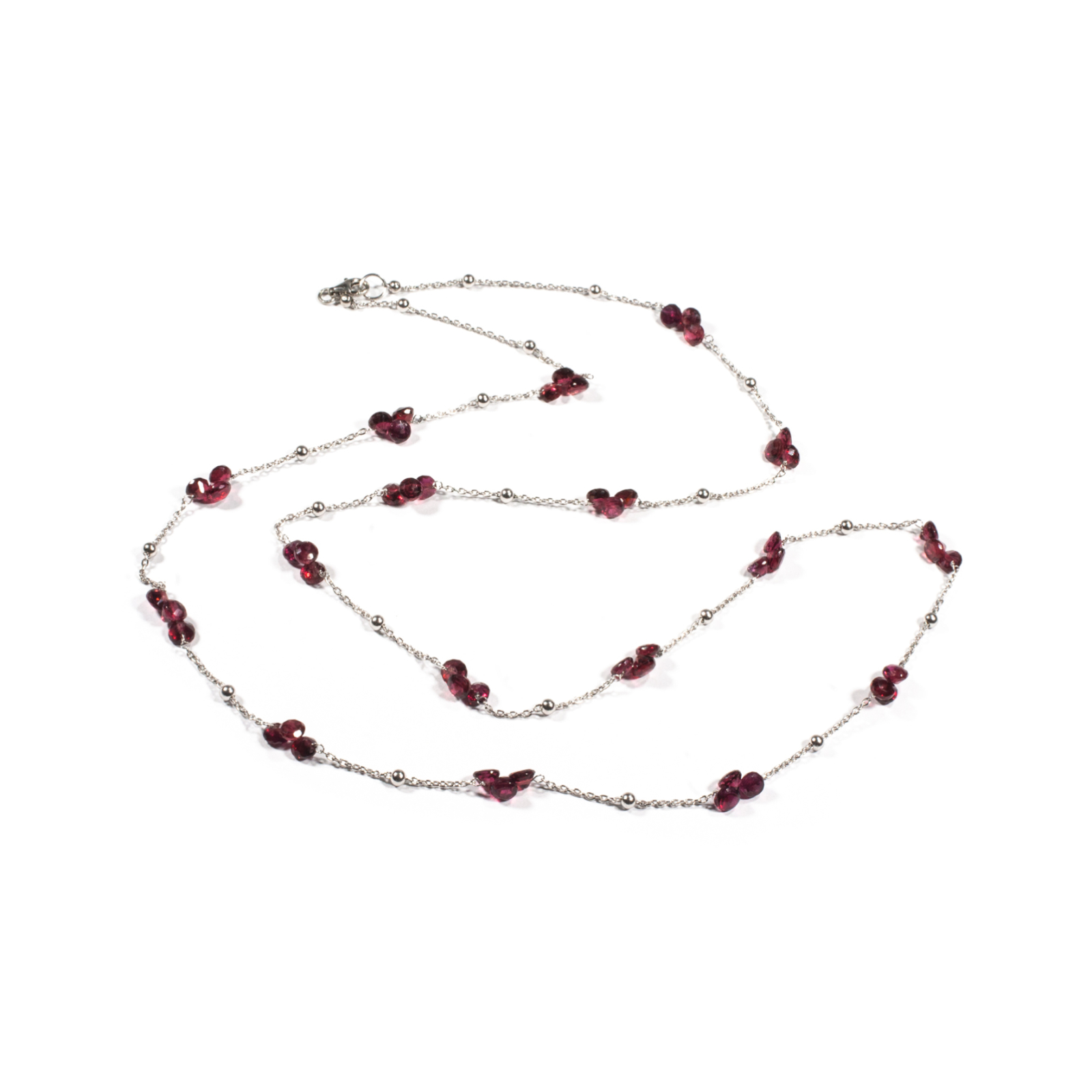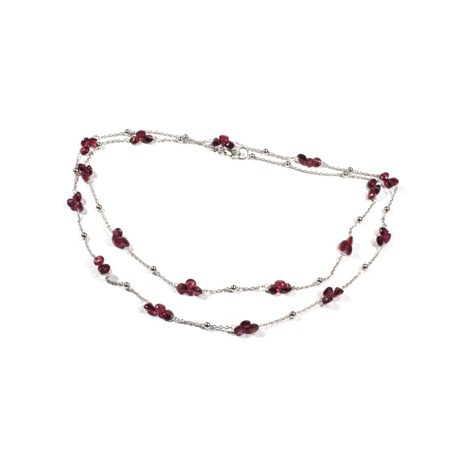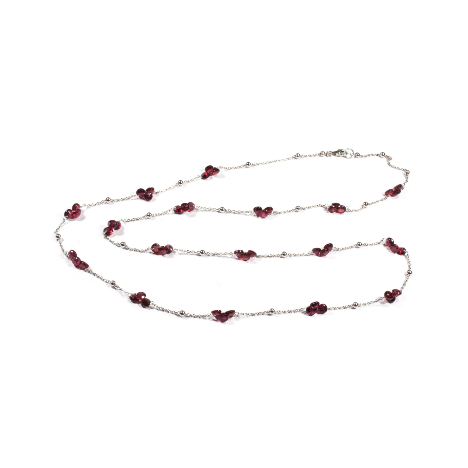 Colier unicat, concept Ioana Condurățeanu, realizat manual în atelierele Sheba din pietre naturale și lanț din argint rodiat. Colierul este alcătuit dintr-un lanț din zale fine din argint cu bobițe ce conține pietre fațetate de granat de formă lacrimă. Contrastul dintre argint și pietrele naturale creează un design modern, echilibrat și versatil. Lungimea colierului și sistemul de închidere de tip carabină permite purtarea lui atât lung, cât și scurt, în jurul gâtului. O bijuterie cu personalitate, potrivită ținutelor de seară sau pentru un accent rafinat peste zi. Pentru a vă accesoriza acest colier vă puteți comanda în funcție de preferințe și ținuta la care doriți să îl purtați, cercei sau brățară în set.