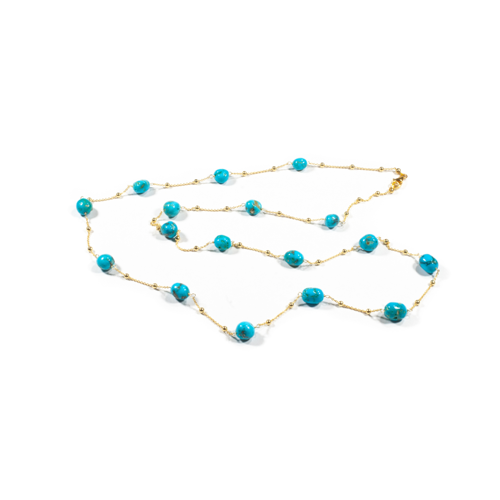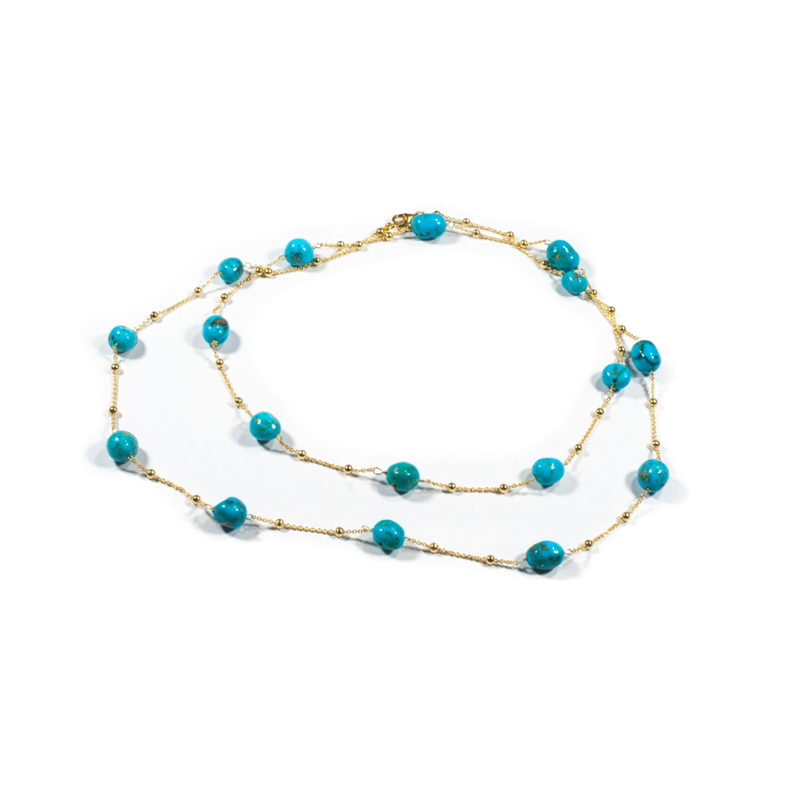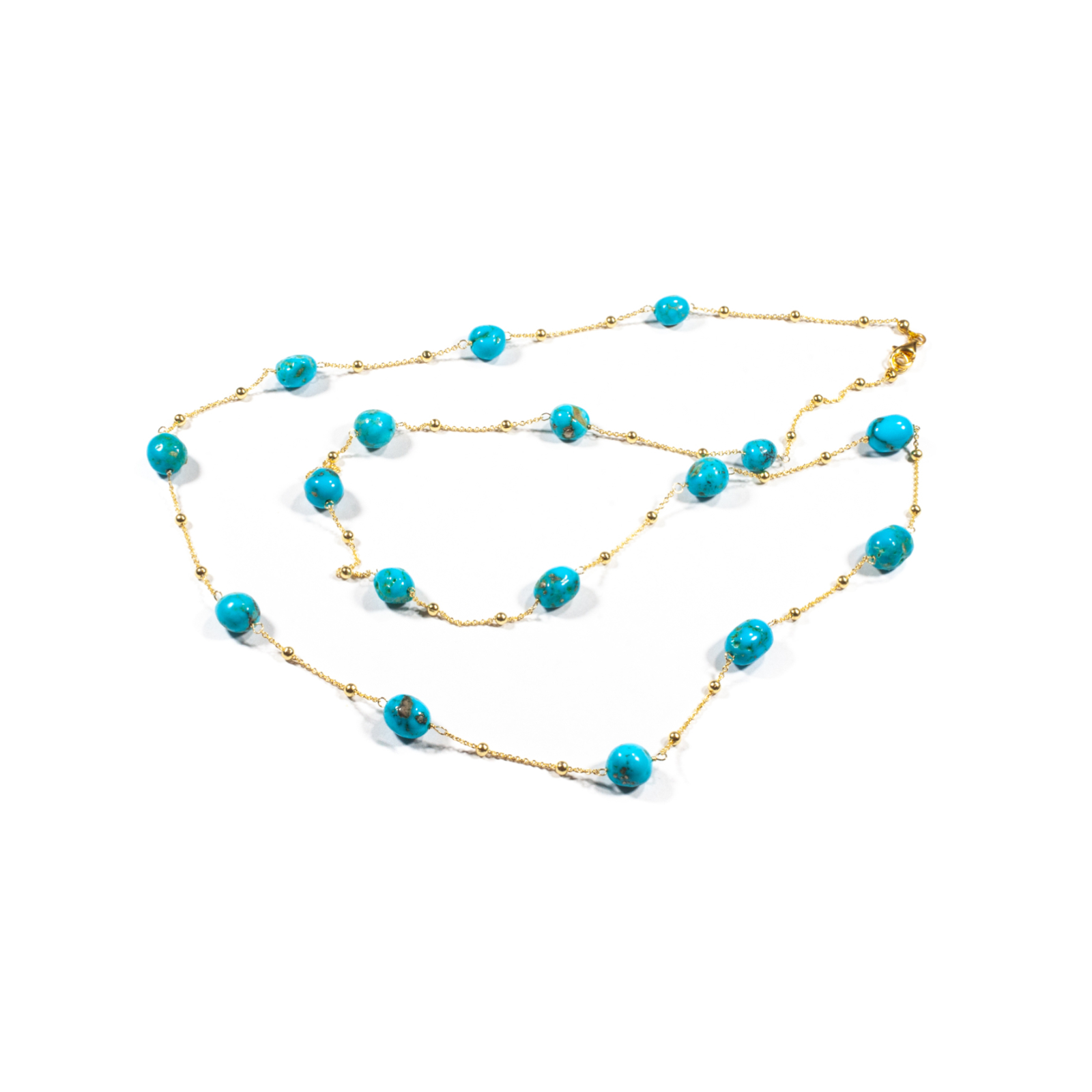 Colier unicat, concept Ioana Condurățeanu, realizat manual în atelierele Sheba din pietre naturale și lanț din argint auriu. Colierul este alcătuit dintr-un lanț din zale fine din argint auriu cu bobițe ce conține pietre cu tăietură caboșon de turcoaz de formă ovală. Contrastul dintre argint și pietrele naturale creează un design modern, echilibrat și versatil. Lungimea colierului și sistemul de închidere de tip carabină permite purtarea lui atât lung, cât și scurt, în jurul gâtului. O bijuterie cu personalitate, potrivită ținutelor de seară sau pentru un accent rafinat peste zi. Pentru a vă accesoriza acest colier vă puteți comanda în funcție de preferințe și ținuta la care doriți să îl purtați, cercei sau brățară în set.