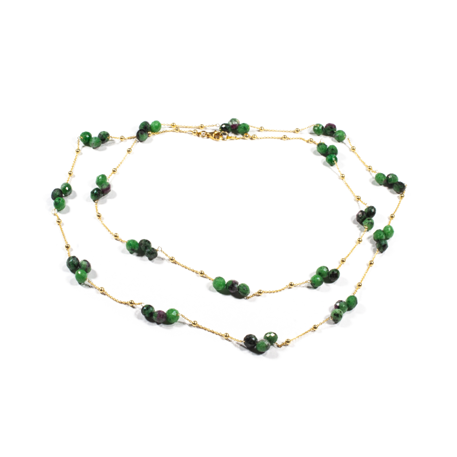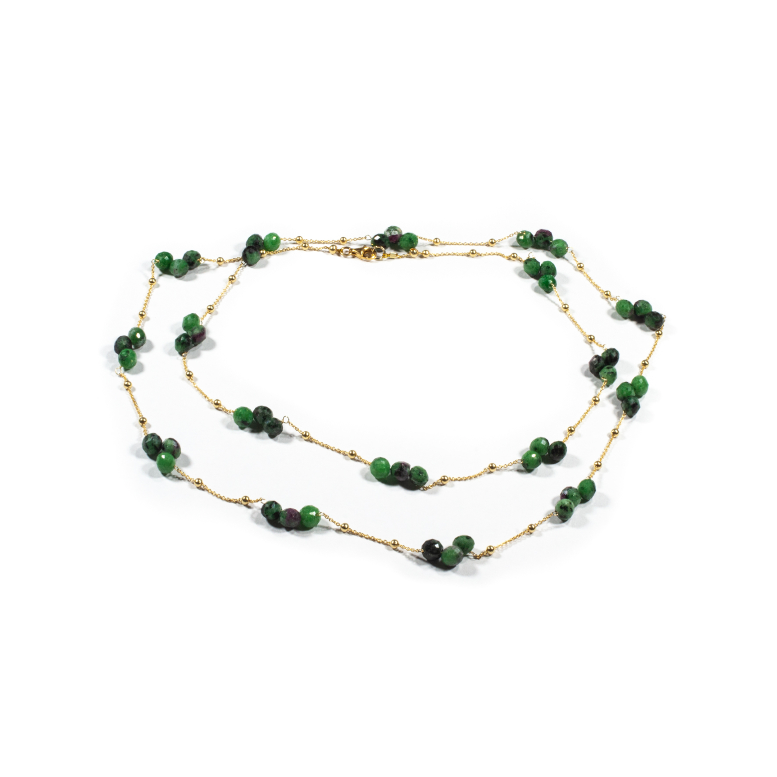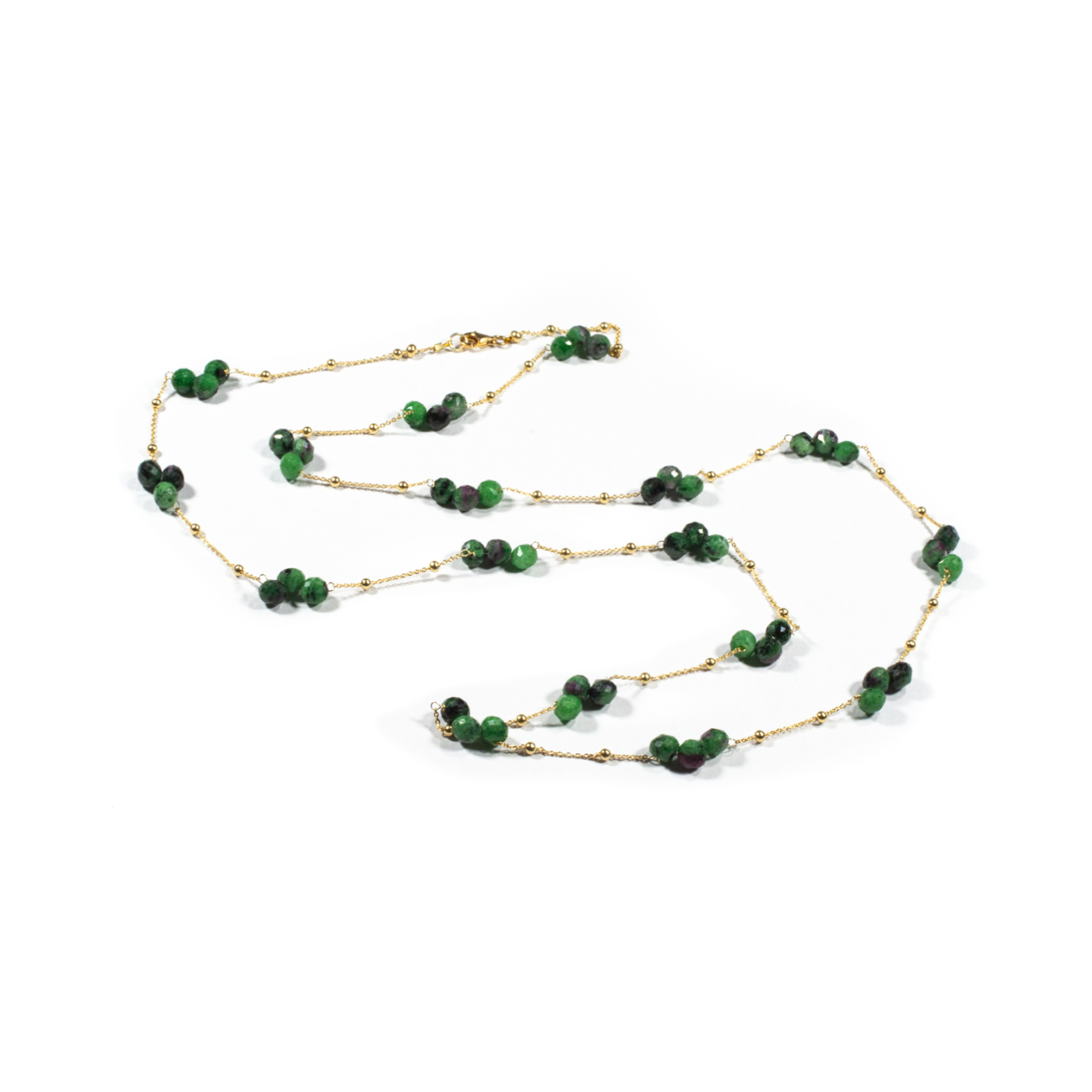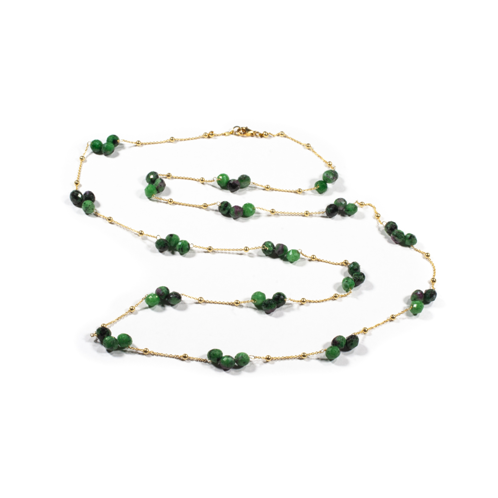 Colier unicat, concept Ioana Condurățeanu, realizat manual în atelierele Sheba din pietre naturale și lanț din argint rodiat. Colierul este alcătuit dintr-un lanț din zale fine din argint cu bobițe ce conține briolete fațetate de zoisit. Contrastul dintre argint și pietrele naturale creează un design modern, echilibrat și versatil. Lungimea colierului și sistemul de închidere de tip carabină permite purtarea lui atât lung, cât și scurt, în jurul gâtului. O bijuterie cu personalitate, potrivită ținutelor de seară sau pentru un accent rafinat peste zi. Pentru a vă accesoriza acest colier vă puteți comanda în funcție de preferințe și ținuta la care doriți să îl purtați, cercei sau brățară în set.