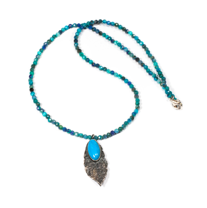 Colier unicat, concept Ioana Condurățeanu, realizat manual în atelierele Sheba din pietre naturale, cu accesorii din argint 92,5% provenit din Italia. Colierul este compus din crisocola, o piatră naturală deosebită, apreciată pentru nuanțele sale intense și expresive, atent aleasă pentru frumusețea și personalitatea compoziției. Pietrele sunt înșirate pe suport din oțel filetat acoperit cu peliculă de protecție, special creat pentru confecționarea bijuteriilor. Sistemul de închidere este de tip carabină, discretă și sigură. Colierul are lungimea de 44 cm și conține 1,90 g argint. Colierul reprezintă o bijuterie rafinată, expresivă și elegantă, ideală pentru a completa o ținută cu un accent natural și sofisticat. Pentru a vă accesoriza acest colier, vă puteți comanda, în funcție de preferințe și de ținuta la care doriți să îl purtați, o brățară sau cercei în set.