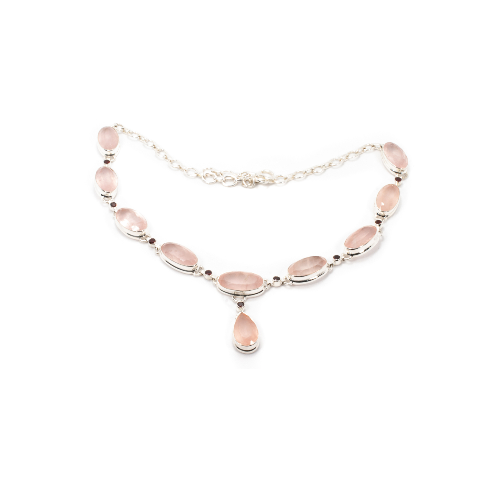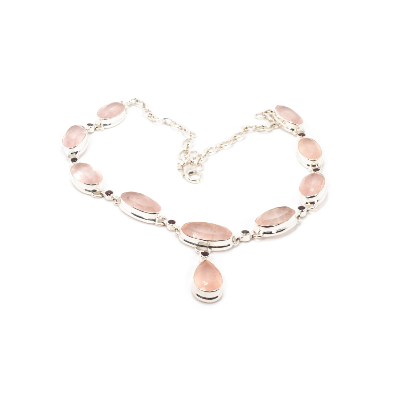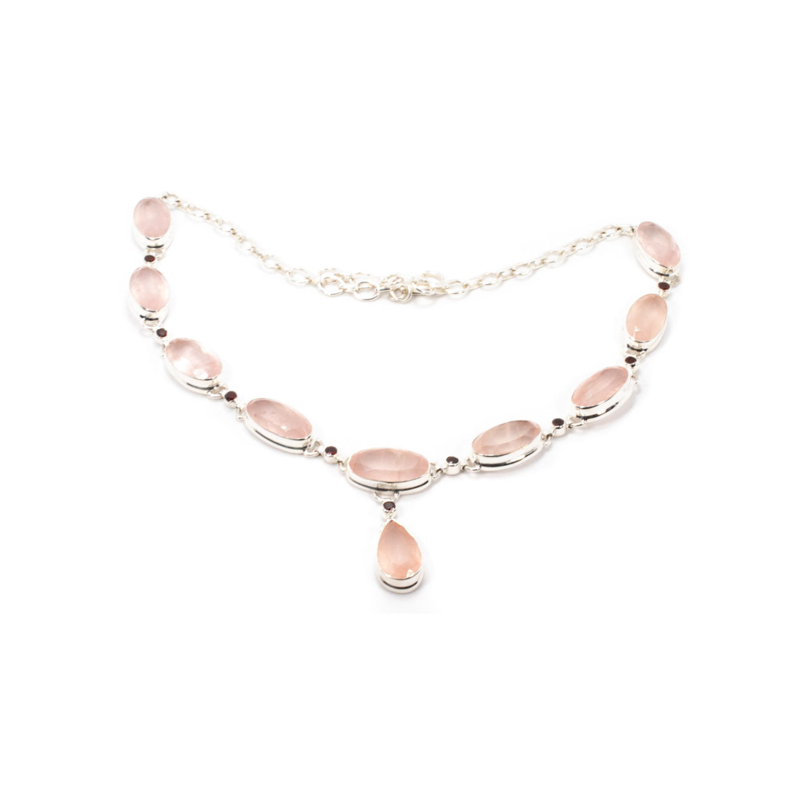 Colier unicat din argint cu pietre naturale. Colierul este compus din pietre cu tăietură caboșon de cuarț roz, de formă ovală, încasetate pe contur. Finisajul impecabil, realizat manual cu atenție la detalii evidențiază irizațiile delicate ale pietrelor. Este un colier statement, rafinat și diafan, potrivit pentru ocazii elegante sau pentru a aduce o notă subtilă de feminitate în ținutele de zi. Colierul dispune de lanț de prelungire pentru ajustarea lungimii după preferință. Pentru un ansamblu complet, consilierii Sheba vă pot oferi asistență, în limita disponibilității.