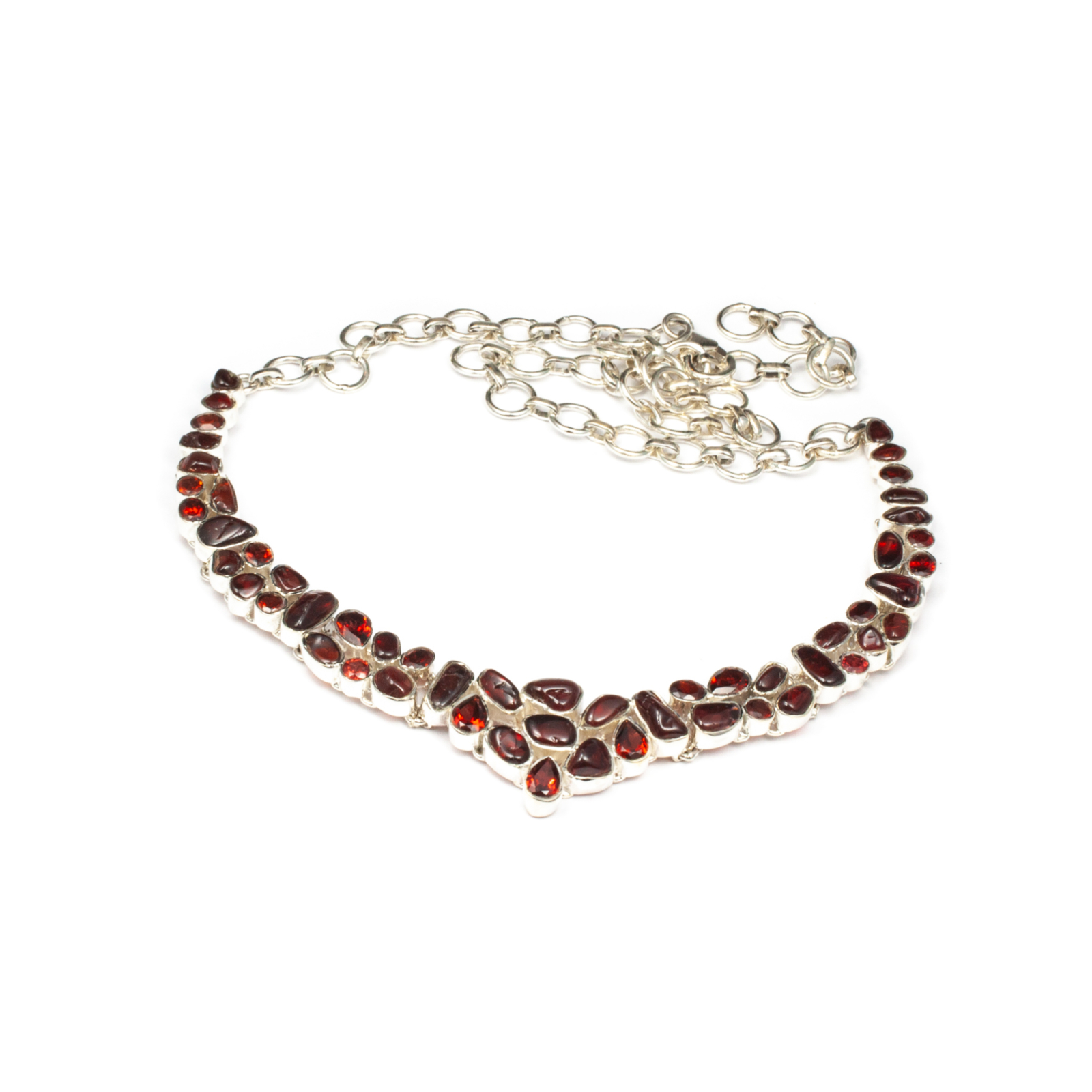 Colier unicat din argint cu pietre naturale. Colierul este compus din pietre cu tăietură caboșon de granat, de formă ovală, lacrimă și rectangulară, încasetate pe contur. Finisajul impecabil, realizat manual cu atenție la detalii evidențiază irizațiile delicate ale pietrelor. Este un colier statement, rafinat și diafan, potrivit pentru ocazii elegante sau pentru a aduce o notă subtilă de feminitate în ținutele de zi. Colierul dispune de lanț de prelungire pentru ajustarea lungimii după preferință. Pentru un ansamblu complet, consilierii Sheba vă pot oferi asistență, în limita disponibilității.