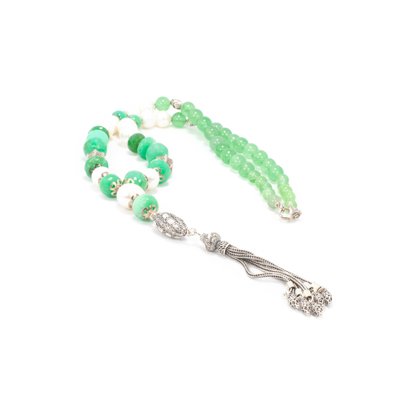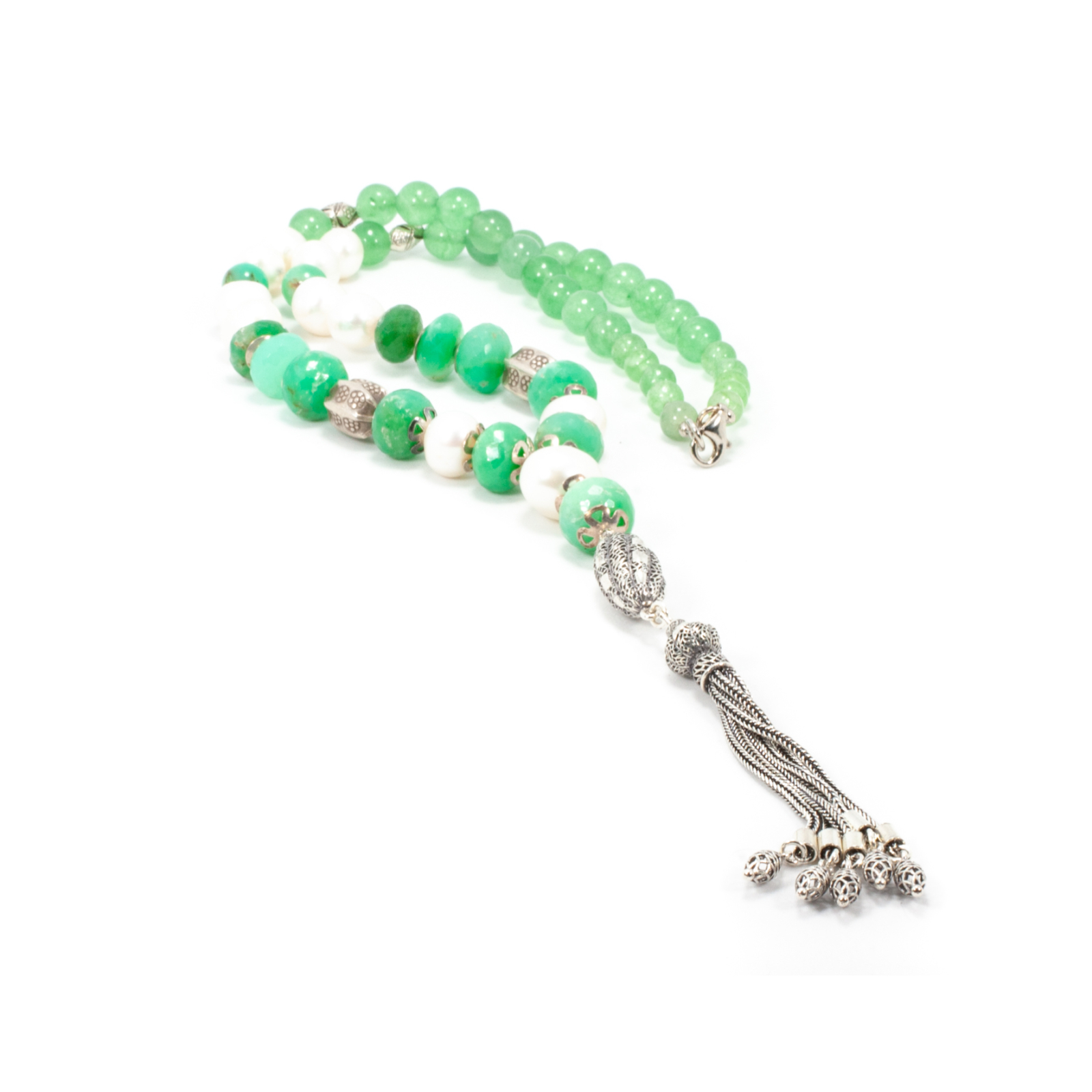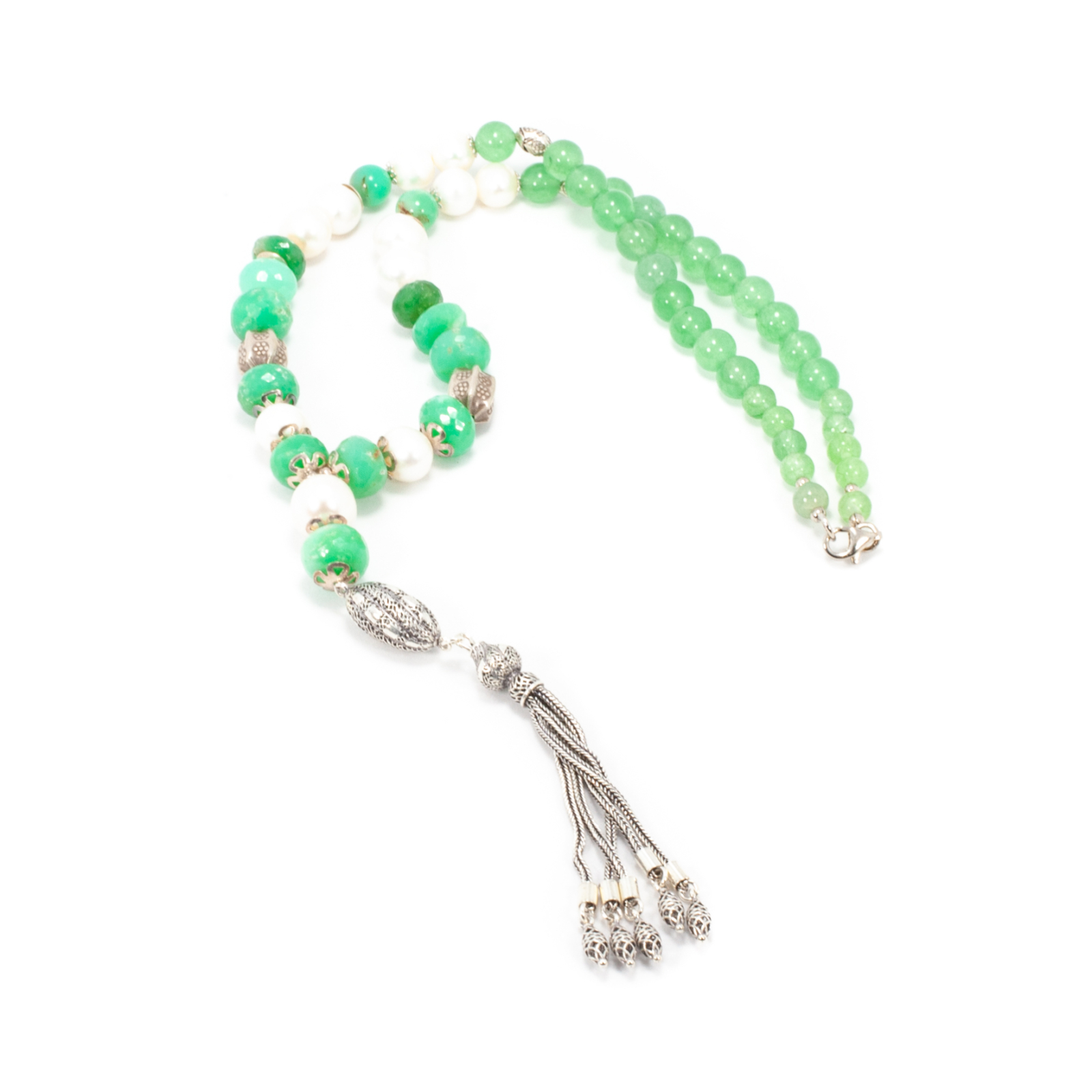 Colier unicat, concept Ioana Condurățeanu, realizat manual în atelierele Sheba din pietre naturale, cu accesorii din argint. Colierul este compus din pietre fațetate și cu tăietură caboșon de crisopraz și din perle de cultură, de formă sferă turtită, iar în zona centrală conține un pandantiv din argint patinat în formă de ciucure. Pietrele sunt înșirate pe suport din oțel filetat acoperit cu peliculă de protecție, special creat pentru confecționarea bijuteriilor. Sistemul de închidere este de tip carabină, discretă și sigură. O bijuterie cu personalitate, potrivită ținutelor de seară sau pentru un accent rafinat peste zi. Pentru a vă accesoriza acest colier vă puteți comanda în funcție de preferințe și ținuta la care doriți să îl purtați, cercei sau brățară în același ton.