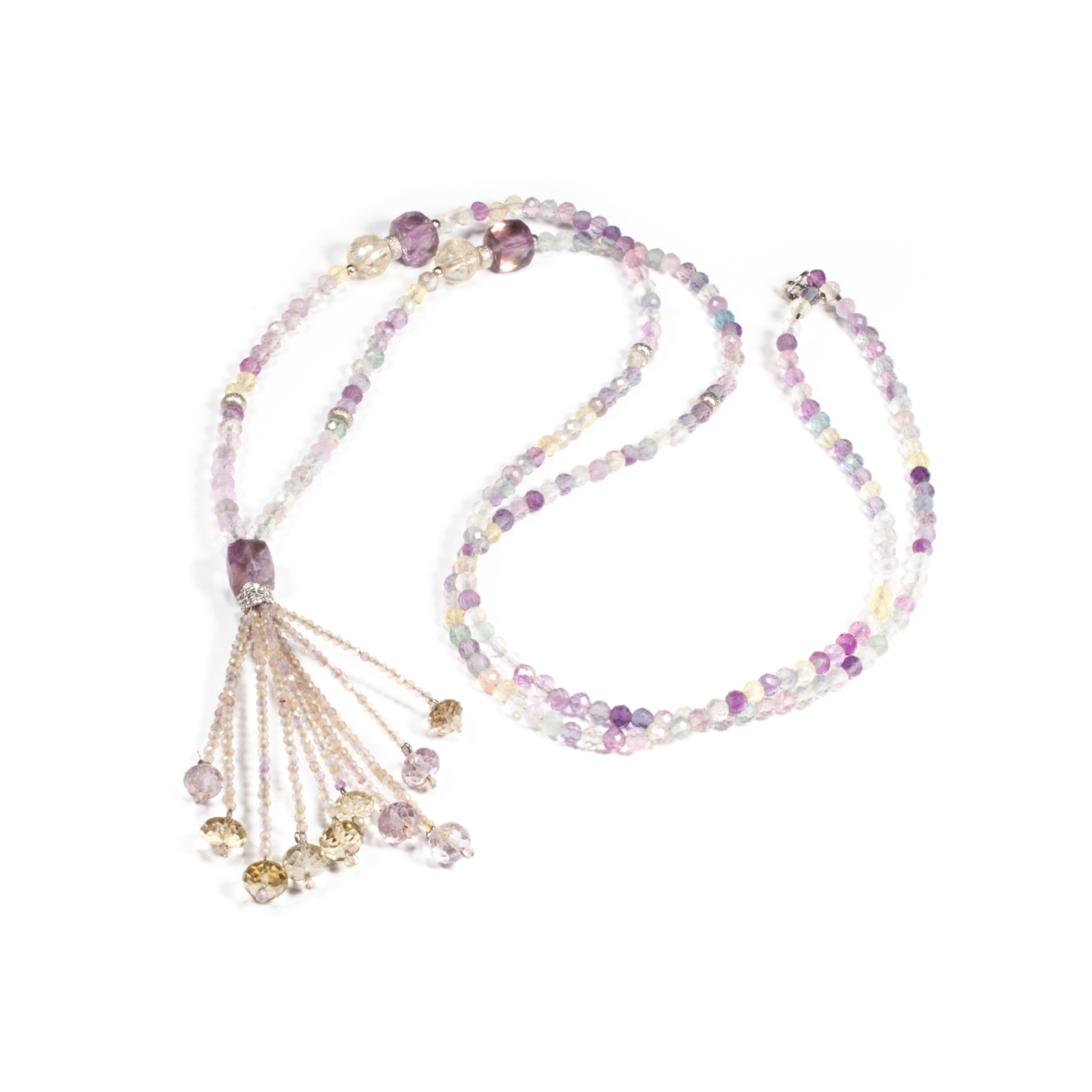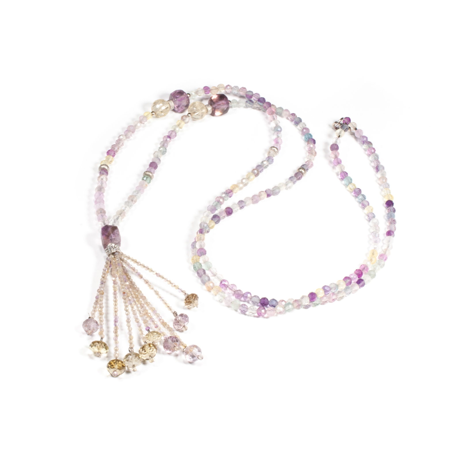 Colier unicat, concept Ioana Condurățeanu, realizat manual în atelierele Sheba din pietre naturale, cu accesorii din argint. Colierul este compus din pietre fațetate de fluorină, ametist și cuarț de formă sferică și rectangulară. Ca element central conține un pandantiv în formă de ciucure compus din pietre fațetate de ametist și cuarț de formă sferică și sferă turtită. Pietrele sunt înșirate pe suport din oțel filetat acoperit cu peliculă de protecție, special creat pentru confecționarea bijuteriilor. Sistemul de închidere este de tip carabină. Colierul reprezintă o bijuterie splendidă, plină de rafinament și de eleganță. Pentru a vă accesoriza acest colier vă puteți comanda în funcție de preferințe și ținuta la care doriți să îl purtați, o brățară sau cercei în set.
