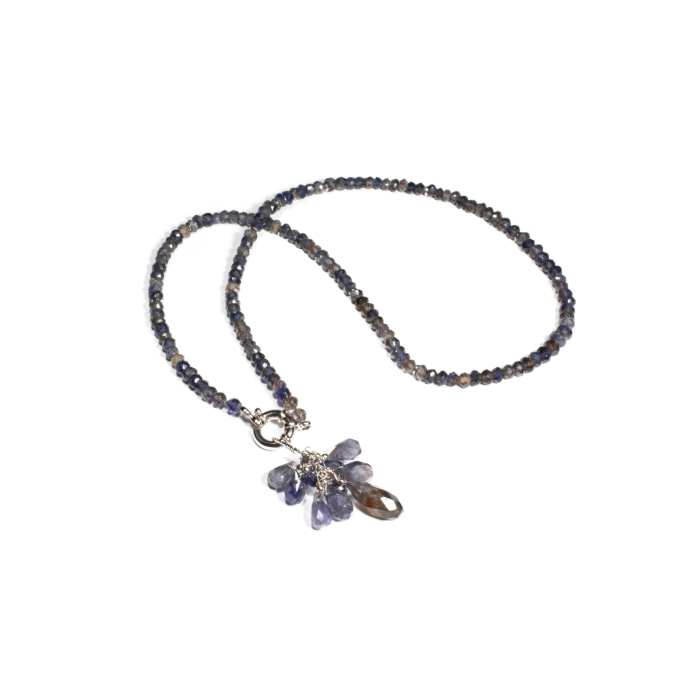 Colier unicat, concept Ioana Condurățeanu, realizat manual în atelierele Sheba din pietre naturale, cu accesorii din argint. Colierul este realizat din pietre fațetate de iolit de formă sferică. În centrul colierului se află un pandativ compus din pietre fațetate de iolit de formă lacrimă, dispuse în formă de ciorchine. Pandantivul se poate scoate de pe colier și purta pe lanțuri de diferite lungimi sau pe o panglică de organza. Pietrele sunt înșirate pe suport din oțel filetat acoperit cu peliculă de protecție, special creat pentru confecționarea bijuteriilor. O bijuterie cu personalitate, potrivită ținutelor de seară sau pentru un accent rafinat peste zi. Pentru a vă accesoriza acest colier vă puteți comanda în funcție de preferințe și ținuta la care doriți să îl purtați, cercei sau brățară în același ton.