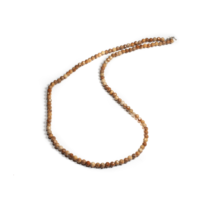 Colier unicat, concept Ioana Condurățeanu, realizat manual în atelierele Sheba din pietre naturale, cu accesorii din argint. Colierul este realizat din pietre fațetate de jasp de formă sferică. Pietrele sunt înșirate pe suport din oțel filetat acoperit cu peliculă de protecție, special creat pentru confecționarea bijuteriilor. Sistemul de închidere este de tip carabină, discretă și sigură. O bijuterie cu personalitate, potrivită ținutelor de seară sau pentru un accent rafinat peste zi. Pentru a vă accesoriza acest colier vă puteți comanda în funcție de preferințe și ținuta la care doriți să îl purtați, cercei sau brățară în același ton.