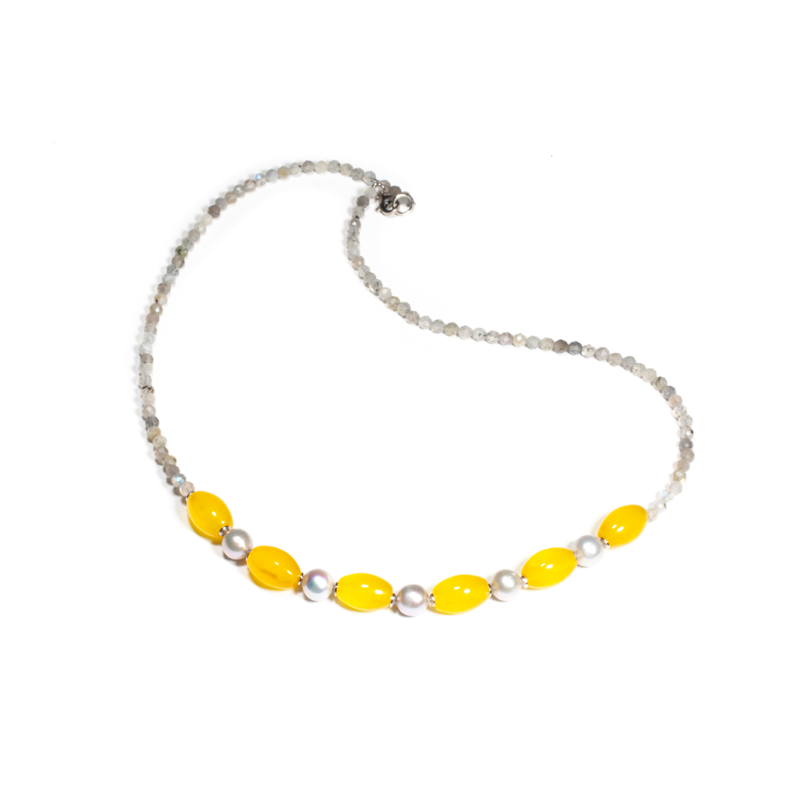 Colier unicat, concept Ioana Condurățeanu, realizat manual în atelierele Sheba din pietre naturale, cu accesorii din argint. Colierul este compus din pietre fațetate de labradorit de formă sferică, din perle de cultură de formă sferică și din pietre cu tăietură caboșon de piatra mierii de formă ovală. Pietrele sunt înșirate pe suport din oțel filetat acoperit cu peliculă de protecție, special creat pentru confecționarea bijuteriilor. Sistemul de închidere este de tip carabină, discretă și sigură. O bijuterie cu personalitate, potrivită ținutelor de seară sau pentru un accent rafinat peste zi. Pentru a vă accesoriza acest colier vă puteți comanda în funcție de preferințe și ținuta la care doriți să îl purtați, cercei sau brățară în același ton.