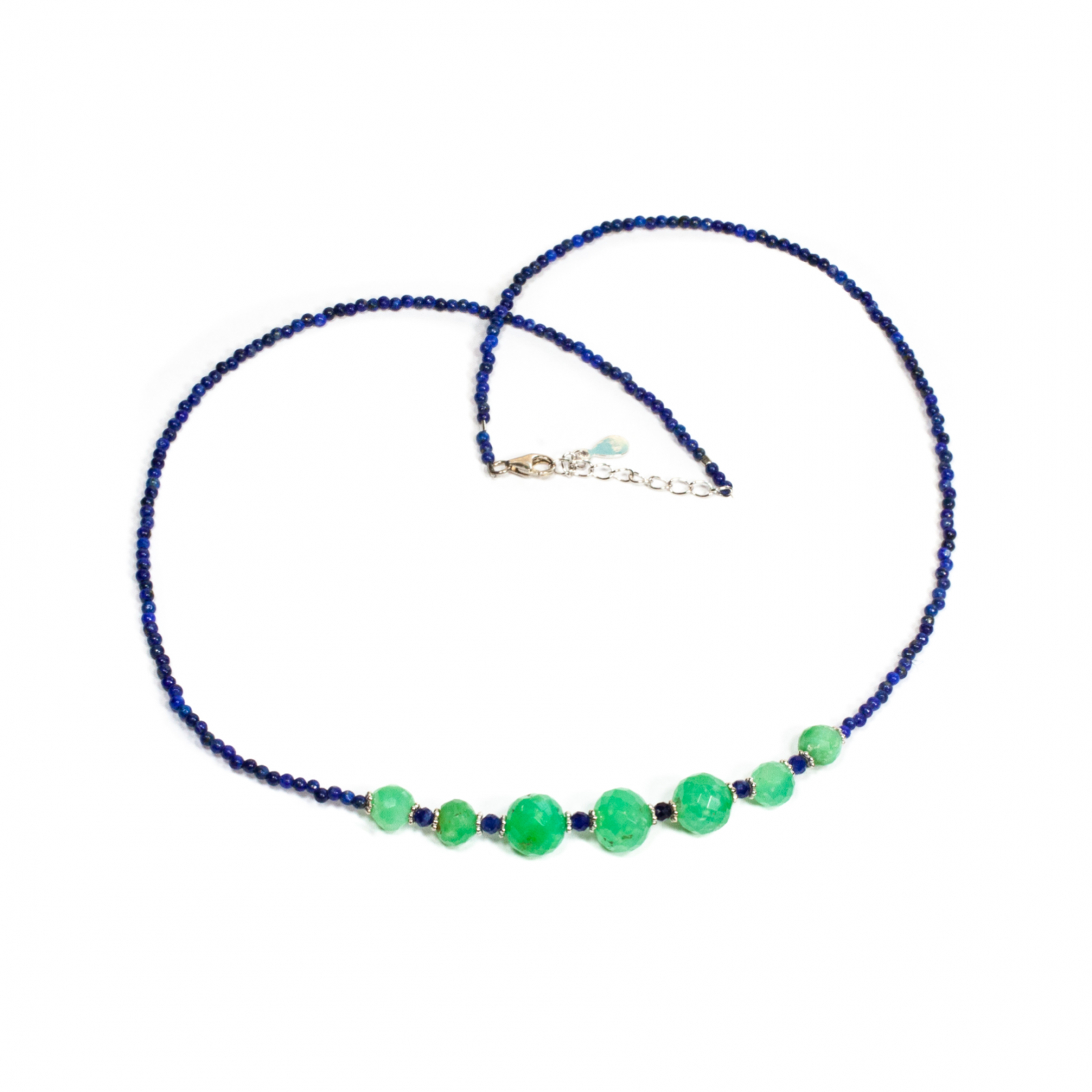 Colier unicat, concept Ioana Condurățeanu, realizat manual în atelierele Sheba din pietre naturale, cu accesorii din argint. Colierul este compus din pietre fațetate de crisopraz de formă sferică și din pietre fațetate de lapis lazuli de formă sferică. Pietrele sunt înșirate pe suport din oțel filetat acoperit cu peliculă de protecție, special creat pentru confecționarea bijuteriilor. Sistemul de închidere este de tip carabină, discretă și sigură. Colierul se poate ajusta ca lungime având lanț de prelungire, pentru a se putea adapta perfect în funcție de preferința dumneavoastră. O bijuterie cu personalitate, potrivită ținutelor de seară sau pentru un accent rafinat peste zi. Colierul reprezintă o bijuterie rafinată și spectaculoasă. Pentru a vă accesoriza acest colier vă puteți comanda în funcție de preferințe și ținuta la care doriți să îl purtați, cercei sau brățară în set.